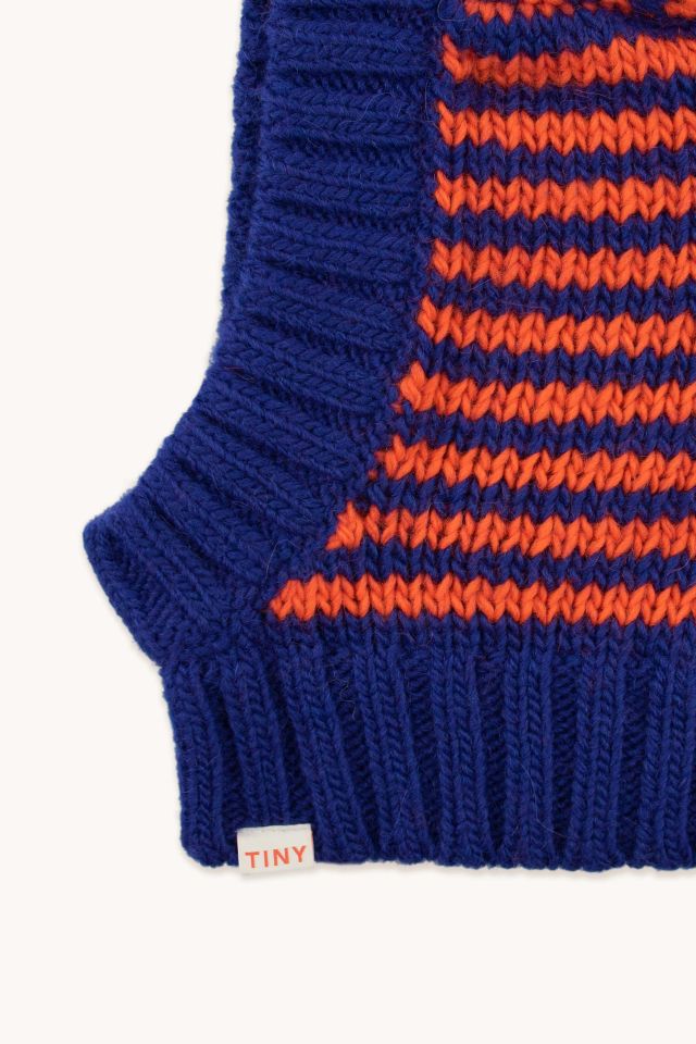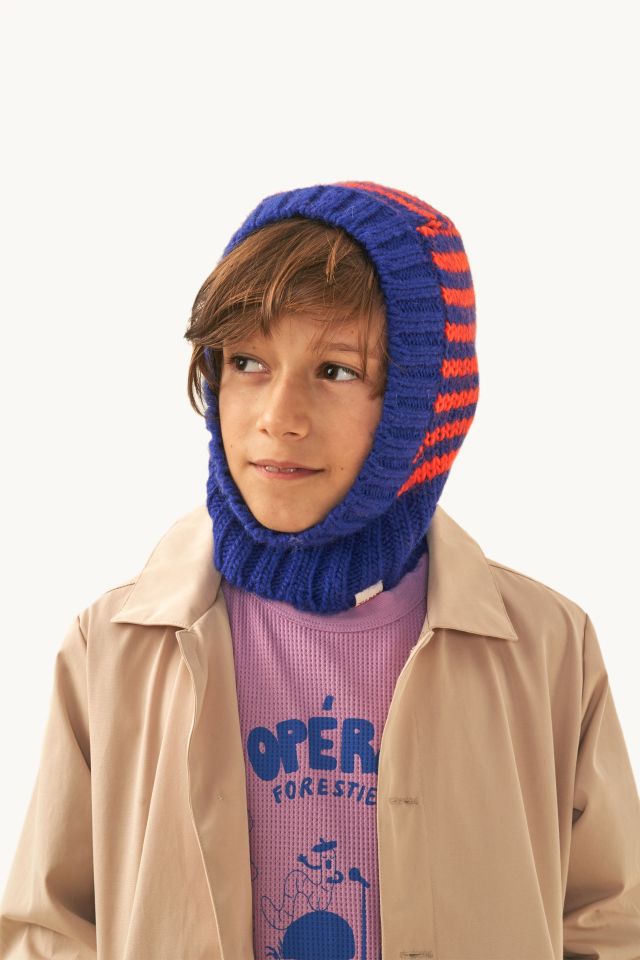 Балаклава крупной вязки в полоску красного цвета и цвета индиго. Модель выполнена из крупного трикотажного материала с отделкой в рубчик. Изготовлена из мягкой смеси шерсти мериноса и альпаки.