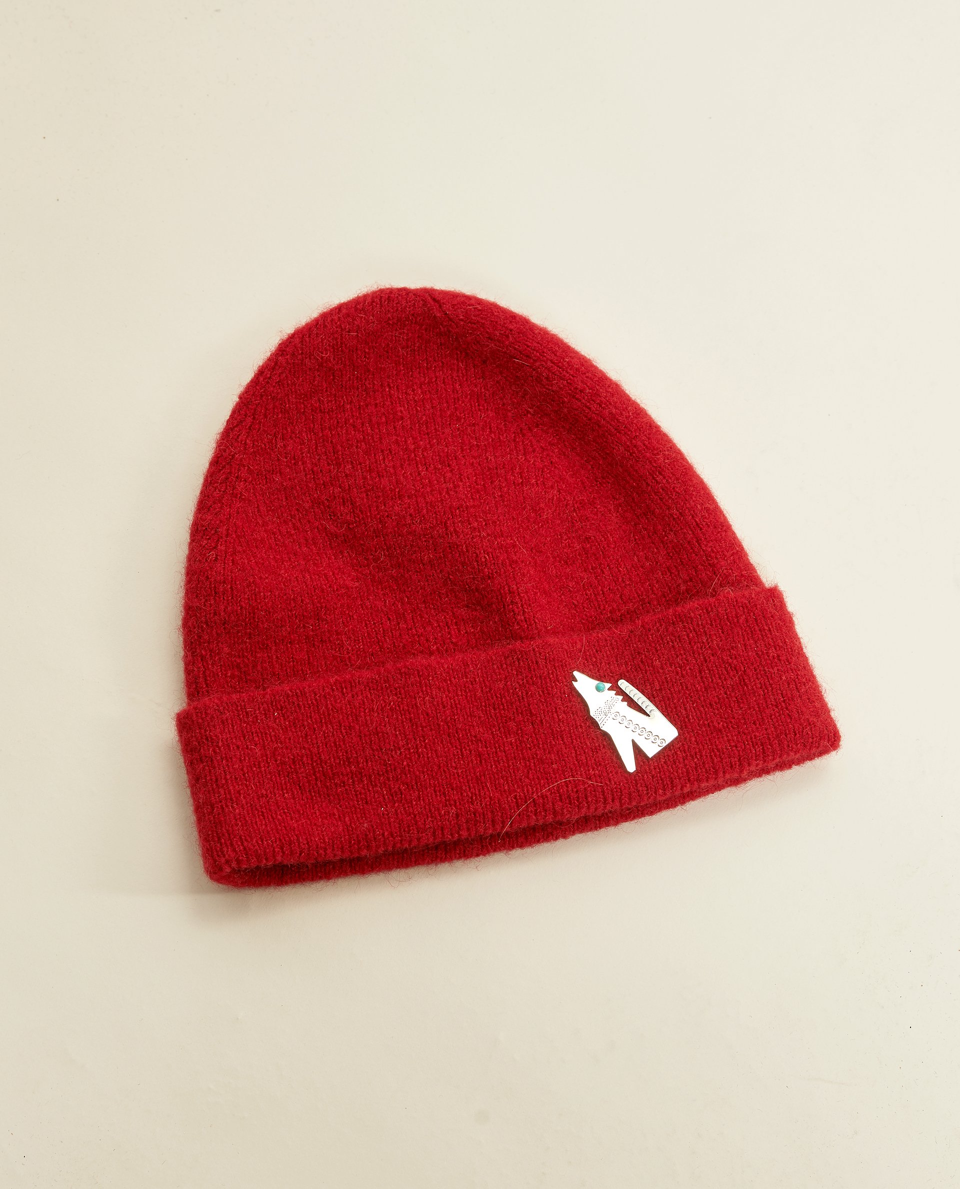 Теплая стильная шапка красного цвета с отворотом и дизайном - металлическая брошь "койот".Производство: КИТАЙ