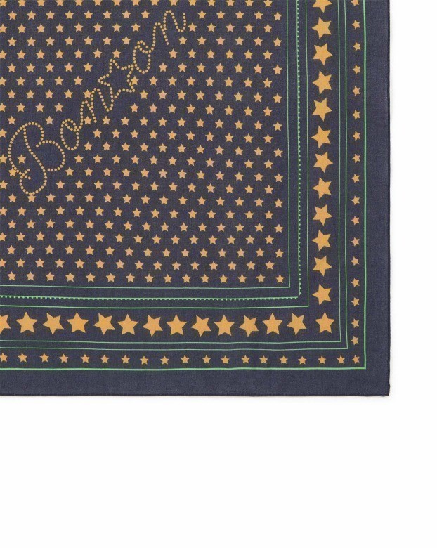 Платок темно-синего цвета из хлопка с принтом из золотых звезд. Можно носить на шее, как дополнение к образу, а можно придать дерзкий вид, повязав на голову в виде банданы.Уход: ручная стирка, не сушить в стиральной машине, гладить при низких температурах (до 110 градусов).