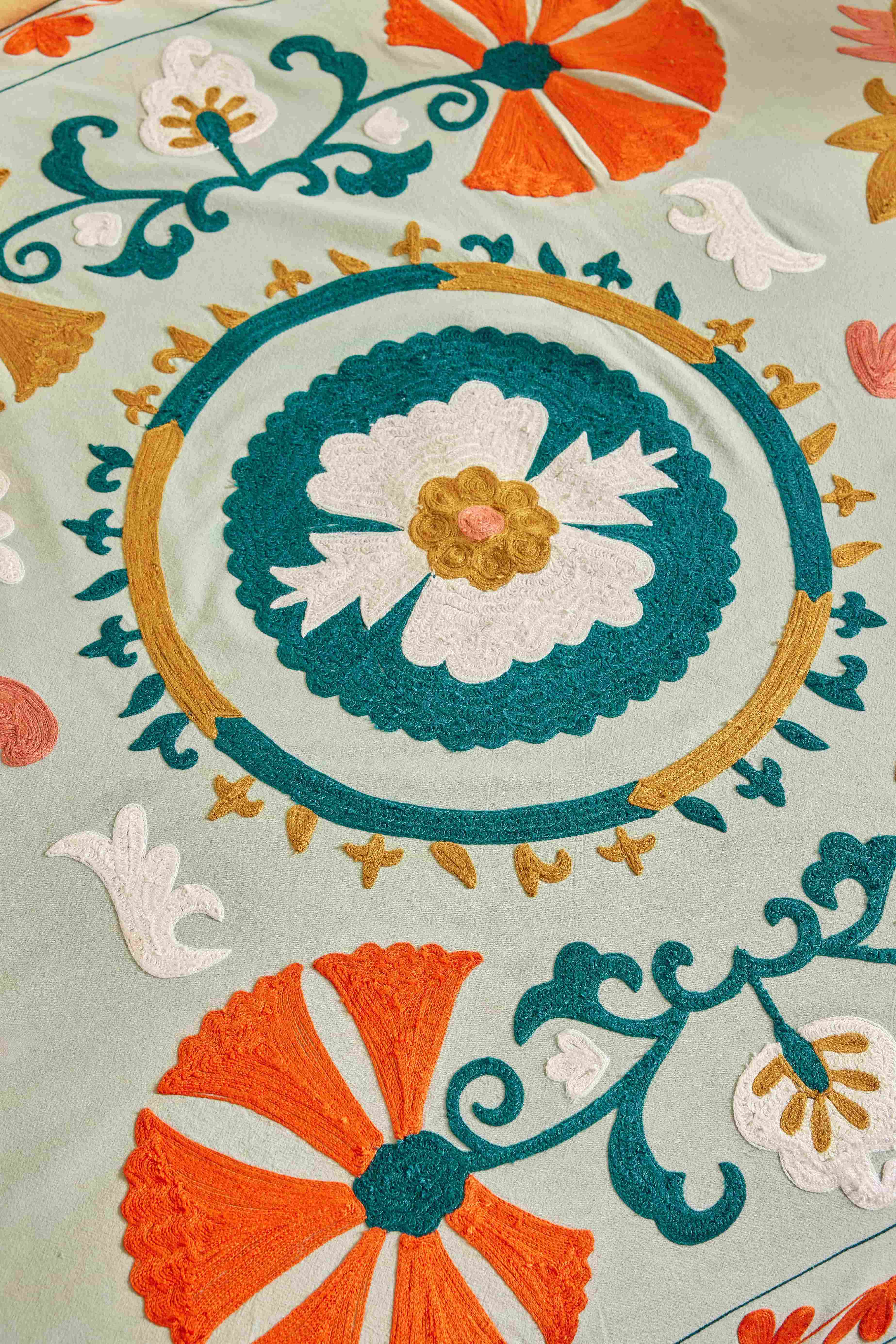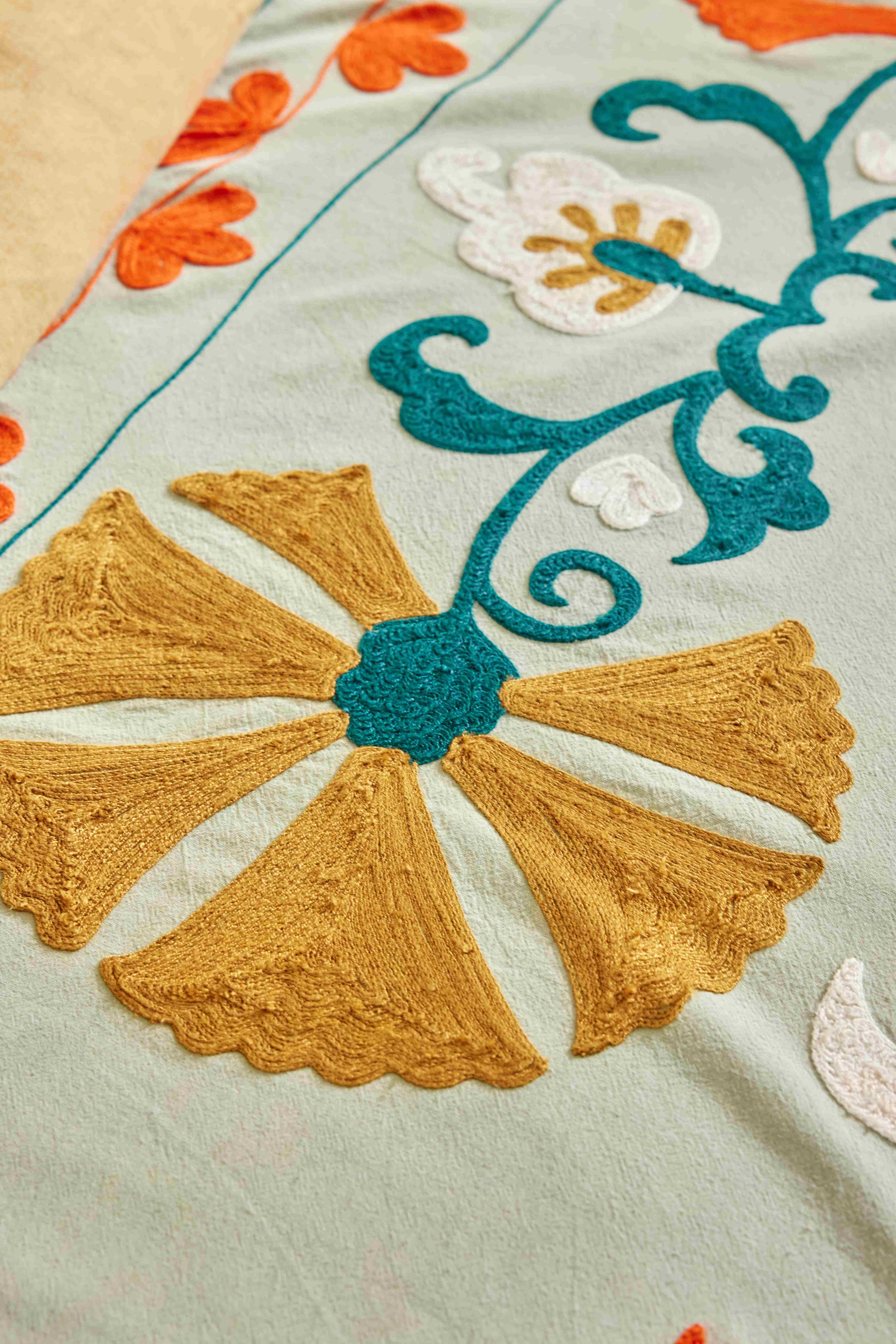 Покрывало "Сюзани", вышито вручную богемными цветами. Наволочка и покрывало для кровати "Сюзани" были разработаны в очаровательном народном "эксклюзивном" стиле талантливым дизайнером интерьера BONHEUR DU JOUR. Индийские мастера вышили его вручную. Это произведение искусства привнесет в ваш дом богемный колорит. Вышивка выполнена в старинной технике "корнели". Покрывало выполнено из плотного, но мягкого хлопка с застежкой на молнии. Его можно использовать для самых разных целей: как покрывало, скатерть, занавеску или плед ... Это изделие придаст красочный, богемный оттенок вашему “милому домашнему очагу”. Уход: сухая чистка. Размеры : 230 см х 150 смПроизводство: ИНДИЯ
