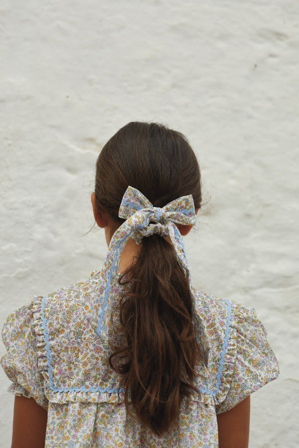 Очаровательный бант на резинке-chouchou выполнен из органического хлопка с фирменным принтом "луг" и отделано небесно-голубой зигзагообразной лентой. Неподвластный времени бант придает каждому наряду элегантность и шарм. Идеально сочетается с платьем Laura.