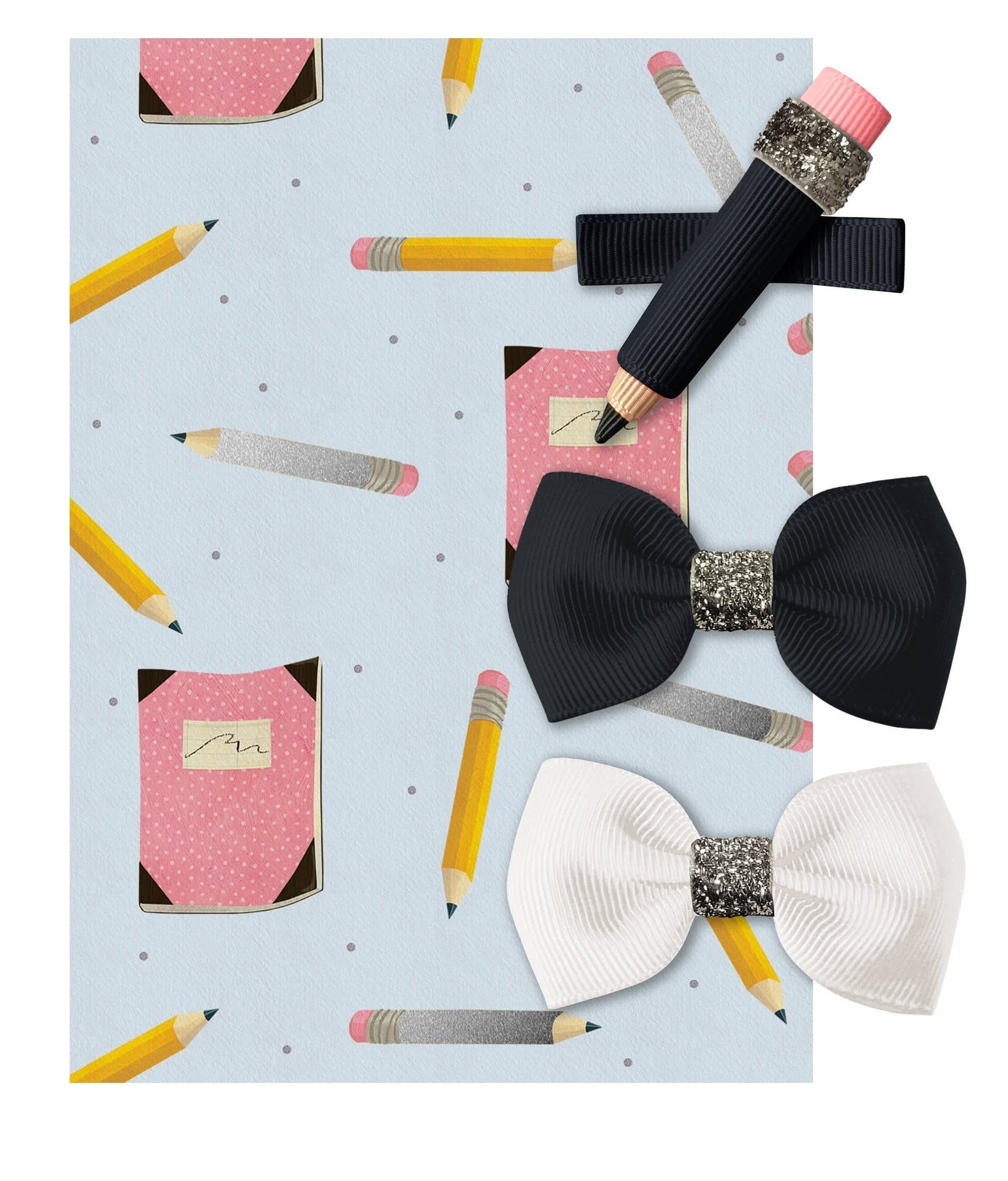 Эти милые заколки классической расцветки дополнят как праздничный, так и повседневный образ. Вы можете надеть их все сразу или по одной, все зависит от Вашего настроения и образа. Этот набор будет хорошим подарком для Вашей подруги.Размеры: заколка Карандаш: заколка - 4,5 см; карандаш - 6 см;заколка Бант: заколка - 4,5 см; бантик - 4 × 6,8 см.