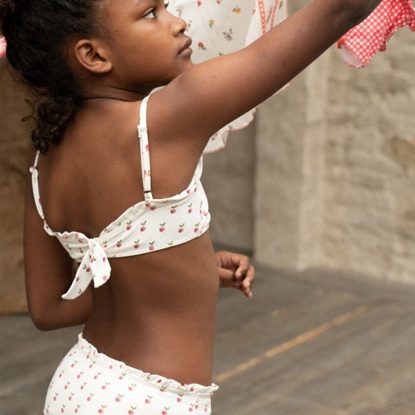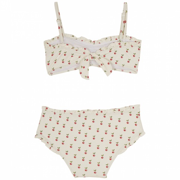 Купальник-бандо из двух частей из микрофибры цвета экрю с принтом в виде яблок. Регулируемые бретели-спагетти, высокий пояс и оборки на бедрах и в верхней части бандо. Бюстгальтер и перед трусиков на подкладке.Производство: ПОРТУГАЛИЯ