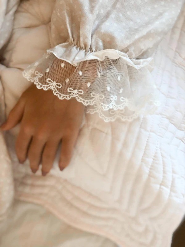 Красивая пижама бежевого цвета в розовый горошек. Удлиненные штанишки, длинный рукав с отделкой по краю кружевом.Очень мягкая и комфортная ткань.Производство: ЭСТОНИЯ