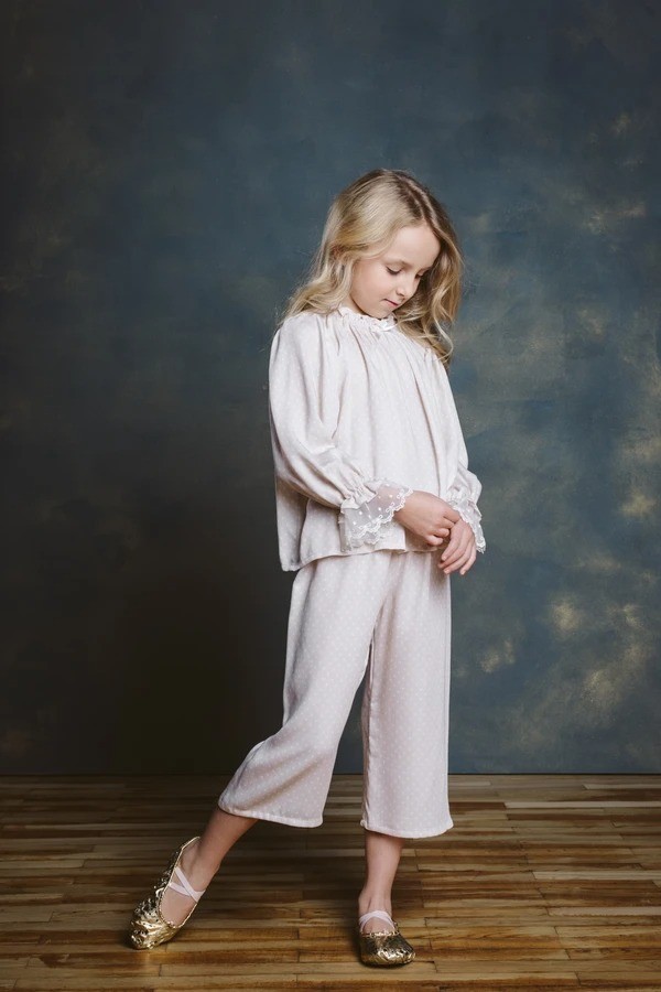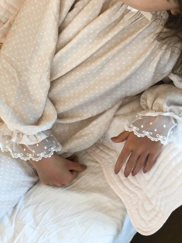 Красивая пижама бежевого цвета в розовый горошек. Удлиненные штанишки, длинный рукав с отделкой по краю кружевом.Очень мягкая и комфортная ткань.Производство: ЭСТОНИЯ