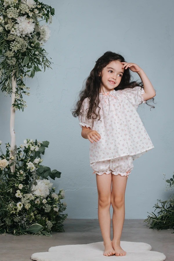 Хлопковая пижама в винтажном стиле для девочек идеальное сочетание красивого дизайна и настоящего комфорта. Эта модель гарантирует вашему малышу полную свободу. Роскошный пижамный комплект с цветочным принтом состоит из двух частей: топ с коротким рукавом на резинке и с нежным бантом и шортами в тон.