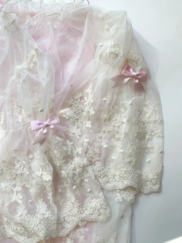 Красивая двухслойная сорочка. Верхняя сорочка состоит полностью из нежного красивого кружева, с отделкой розовыми шелковыми бантиками на рукавах.Внутренняя хлопковая сорочка нежно розового цвета. Комфорт и качество.