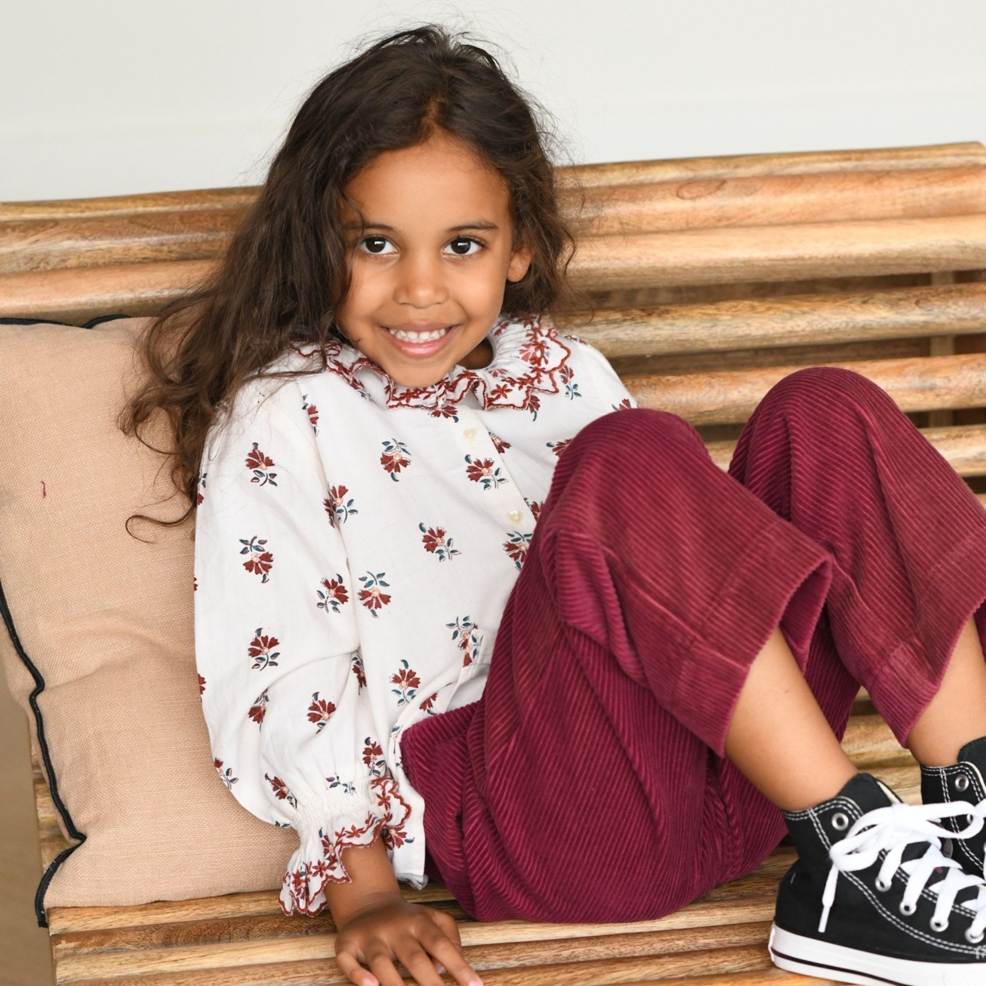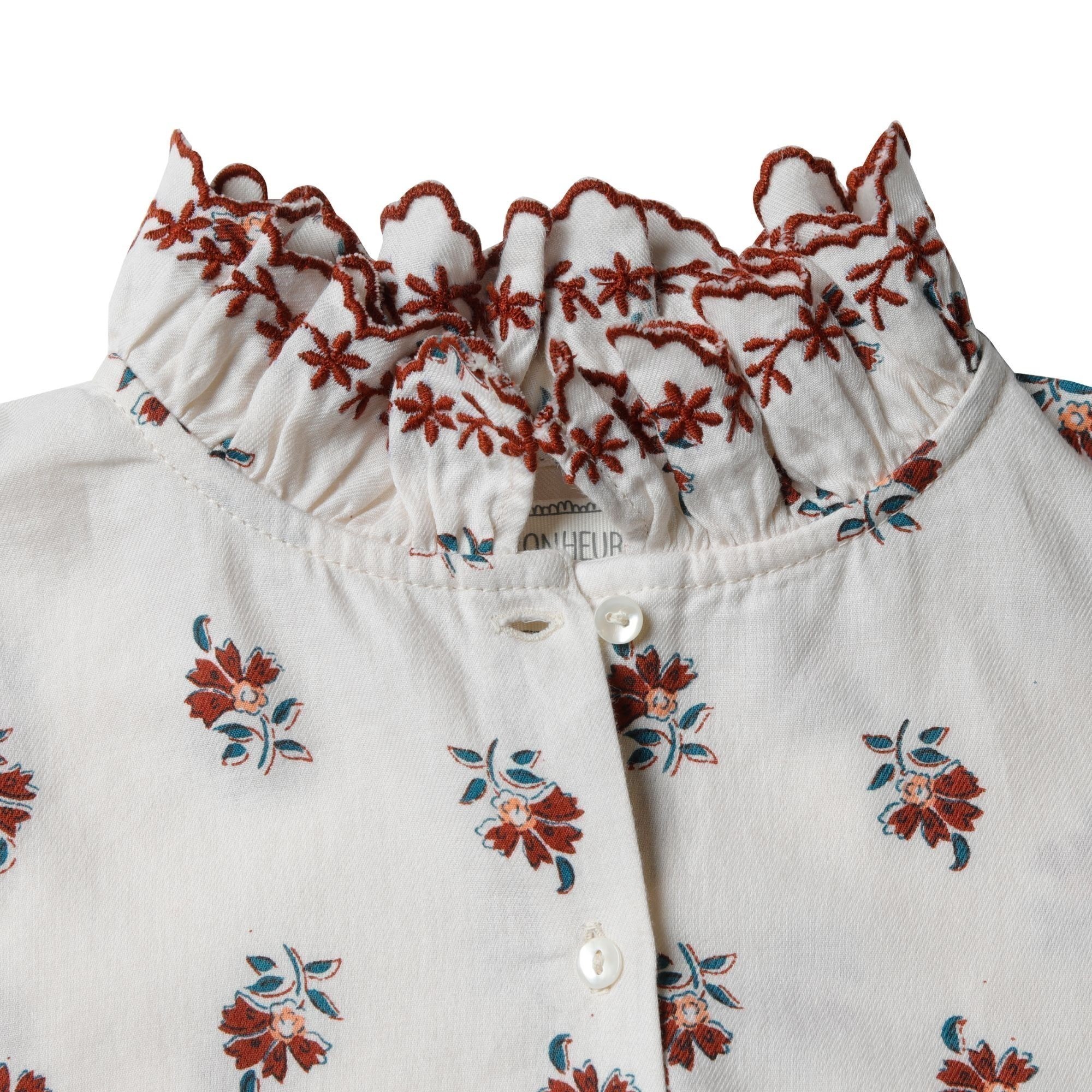 Блузка «богемная» с цветочным принтом в индийском стиле цвета экрю, эксклюзивный дизайн от нашего графического дизайнера. Блуза застегивается спереди на пуговицы, фестончатая вышивка на воротнике и по низу эластичных рукавов, выполнена из мягкой саржи.