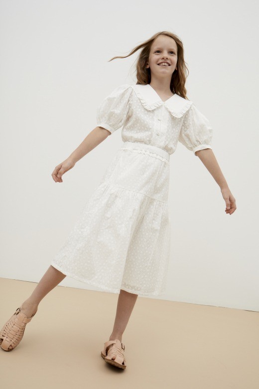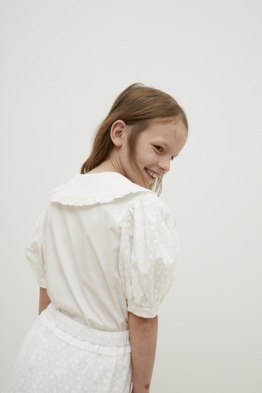 Блузка из 100% хлопка с английской вышивкой. Большой воротник с рюшами, открытый спереди на пуговицах-ракушках, большой объемный рукав.Производство: ПОРТУГАЛИЯ