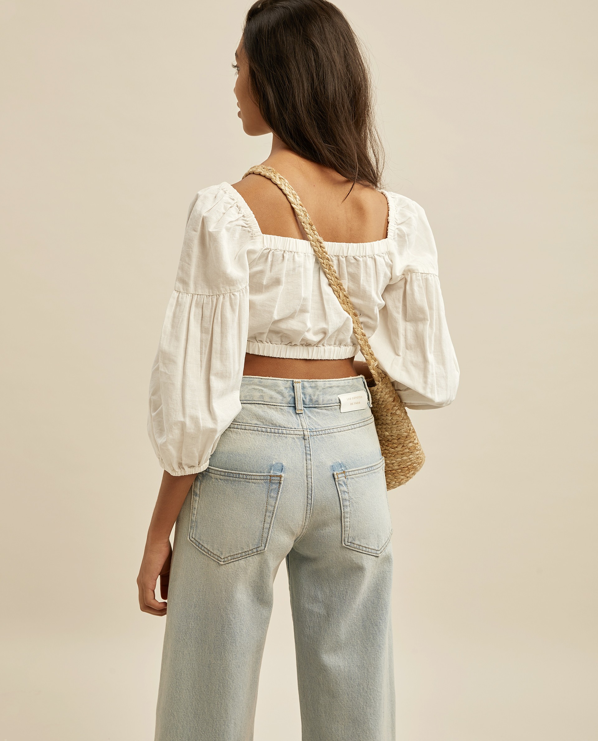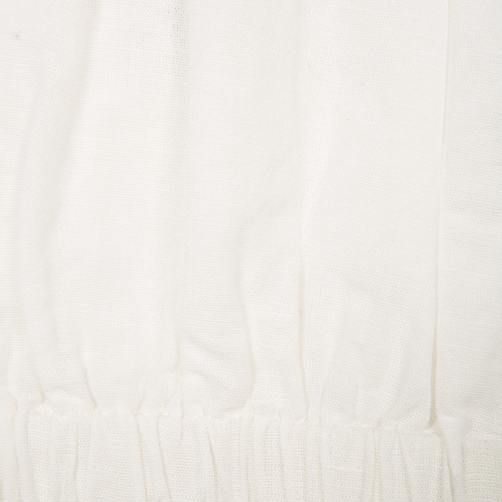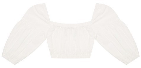 Необычная и красивая блуза-топ белого цвета. Рукава фонарики до локтя. По всему изделию проходит мягкая резинка, что делает блузу очень удобной в использовании.