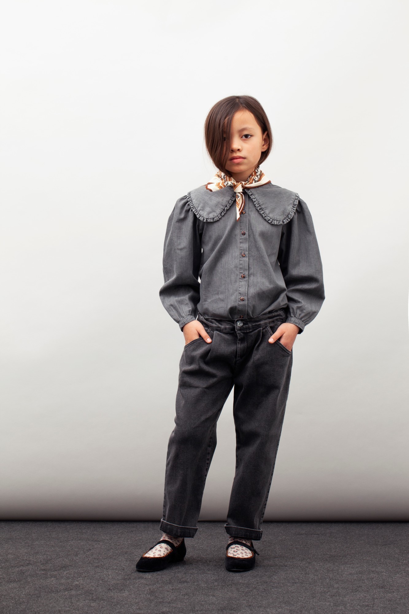 Черная джинсовая детская блуза с большой горловиной, объемными рукавами и пуговицами с животным принтом.