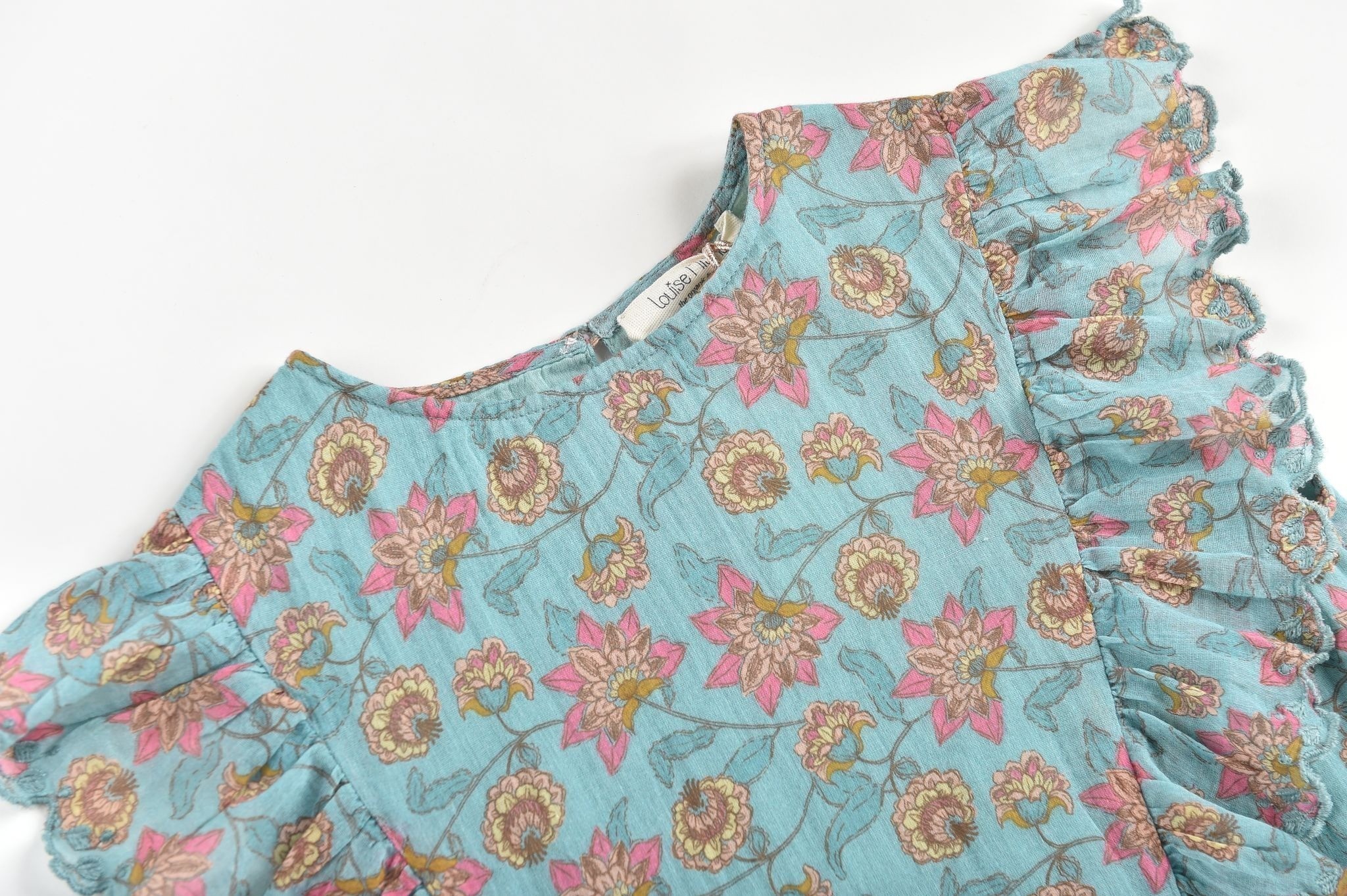 Необычная блуза из 100% органического хлопка без рукавов с нежным цветочным принтом. Рукава с оборками, сходящимися книзу, оригинальное решение модельеров. Застегивается на пуговицы сзади.Производство: КИТАЙ