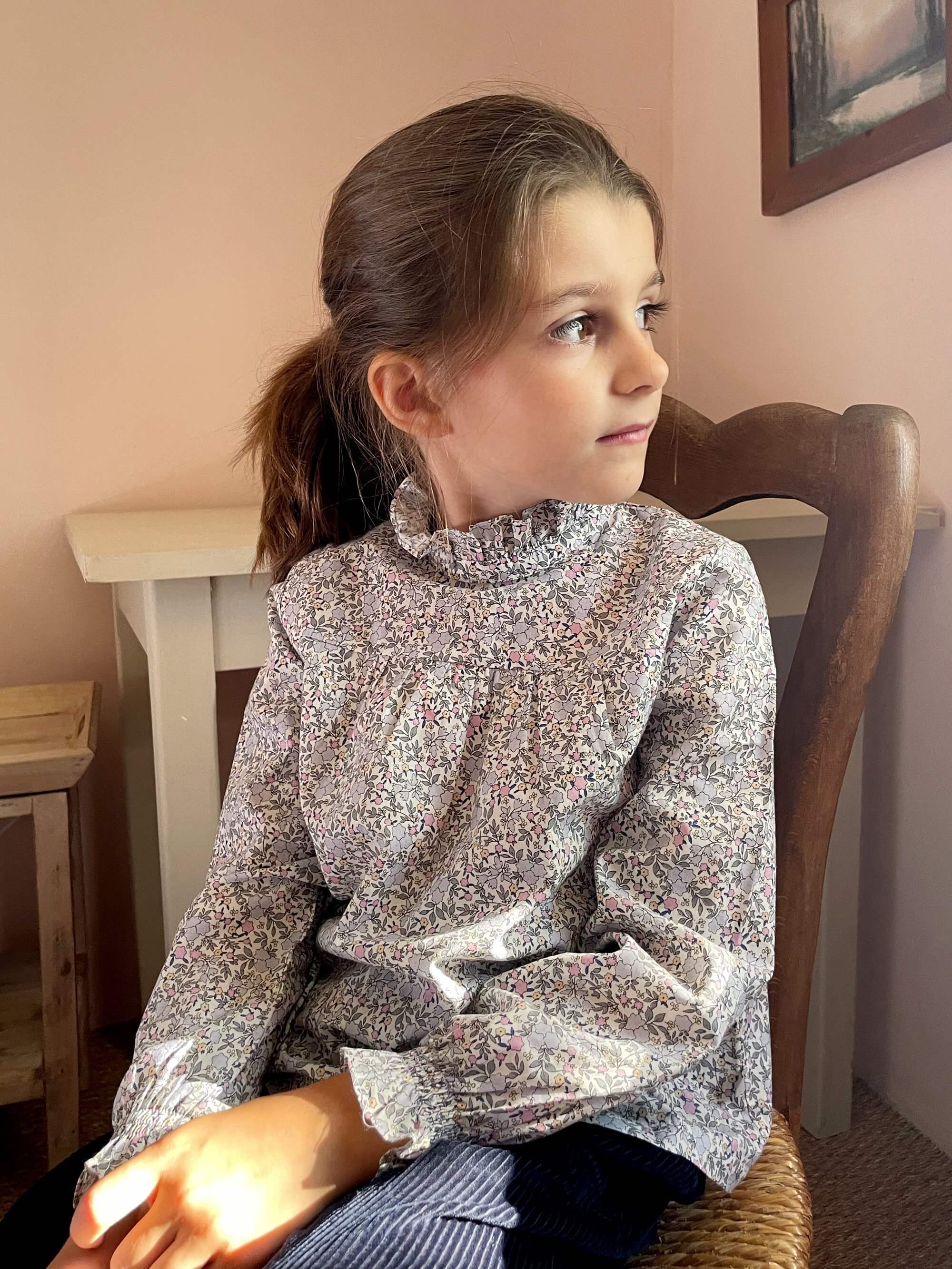 Эта элегантная блуза с розово-синим цветочным принтом украшена рюшами на воротнике и золотой пуговицей на спине.Производство: ПОРТУГАЛИЯ