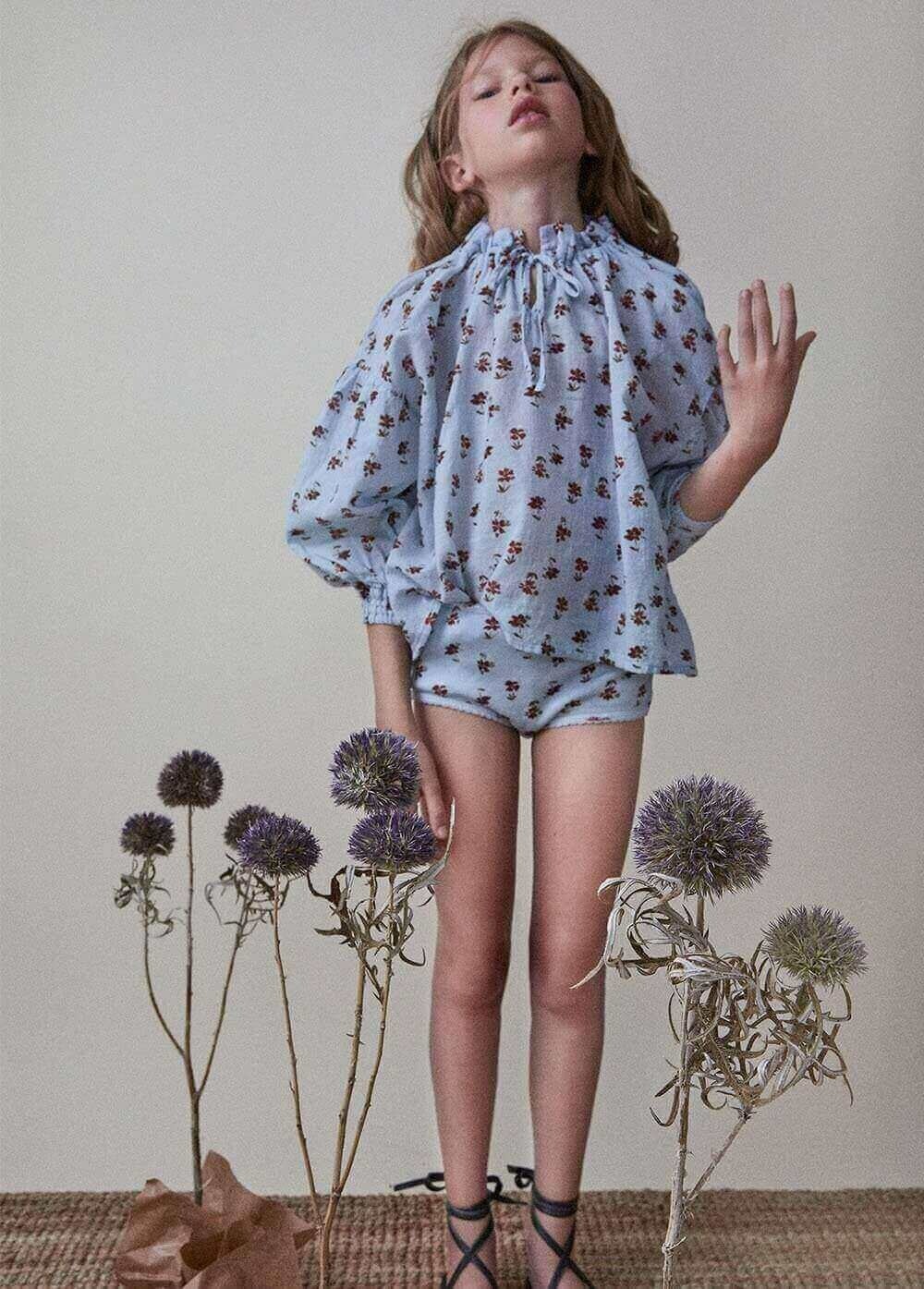Очень нежная голубая блуза с цветочным принтом. Длинный рукав на резинке V-образный воротник с завязкой, для более удобной носки и создания милого образа. Натуральный состав из 100% органического хлопка подходит для чувствительной кожи.