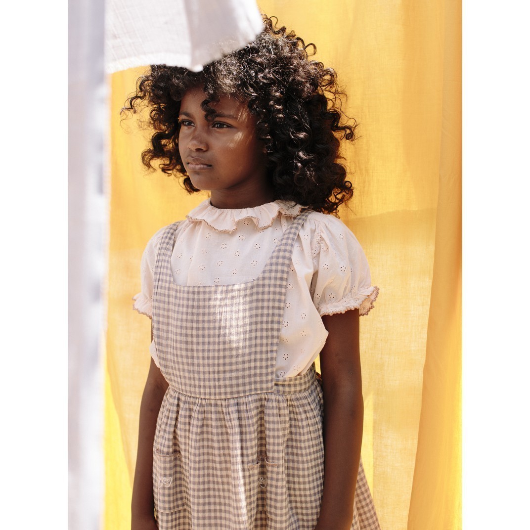 Блуза с английской вышивкой. Хлопковый перкаль, расшитый мелкими цветочками, подчеркивает простой расклешенный крой. Воротник у горловины и низ рукавов-баллонов обработан гладью. Сзади предусмотрена прорезь с 3 перламутровыми пуговицами.