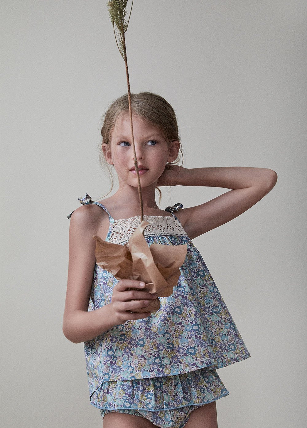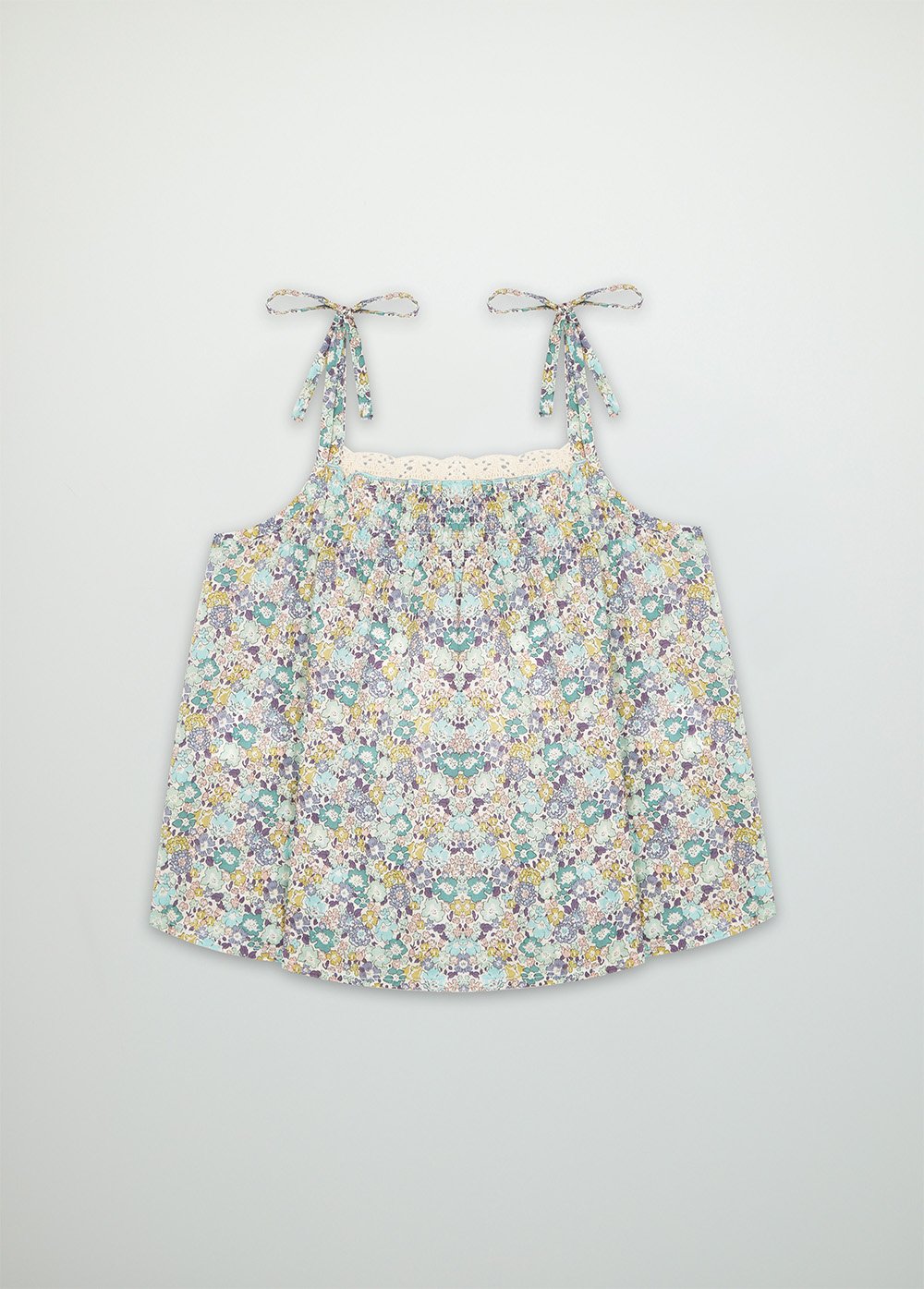 Удобный, легкий топ из ткани либерти. Тонкие бретели регулируются по Вашему желанию, а декор кокетки шитьем цвета экрю, сделает Вашу девочку самой нежной. Свободный крой не будет стеснять движений, а для завершения образа у нас есть панама аналогичной расцветки (артикул SS21A900101)