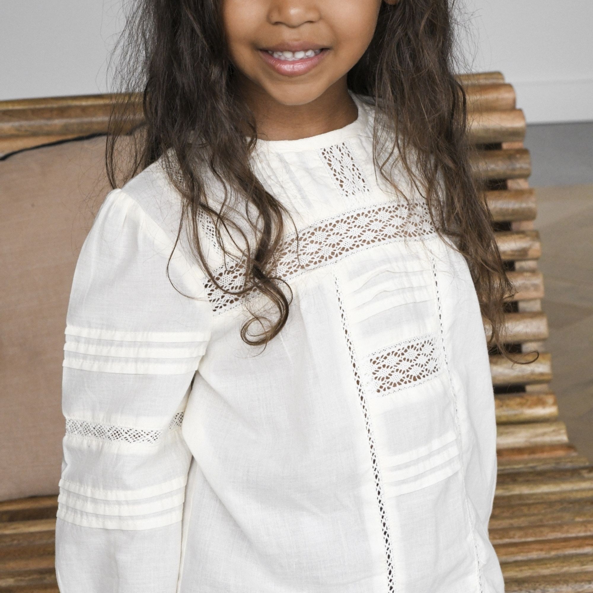Утонченная винтажная блузка c плиссированными деталями. Это всесезонная модель, которую можно носить поверх джинсов в школу или для особых моментов. Винтажное кружево и тонкие плоские складки делают ее уникальной, круглый вырез горловины с косой отделкой, пуговицы сзади и красивые манжеты, кокетка спереди и сзади красиво собрана.