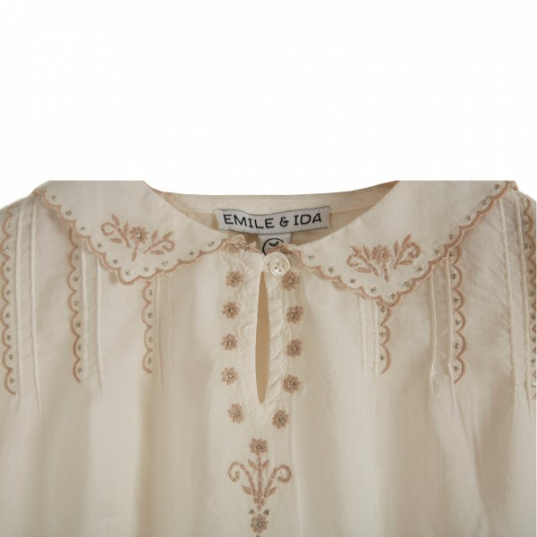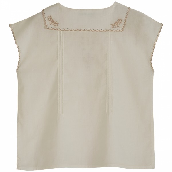 Блузка из хлопковой вуали цвета экрю с нежной вышивкой. Модель относит нас к в 70-м. Без рукавов, с квадратным воротником на круглом вырезе горловины с разрезом на пуговицах. Фестоны вокруг проймы и воротника выделены карамельной гладью. складки спереди и сзади воротника.