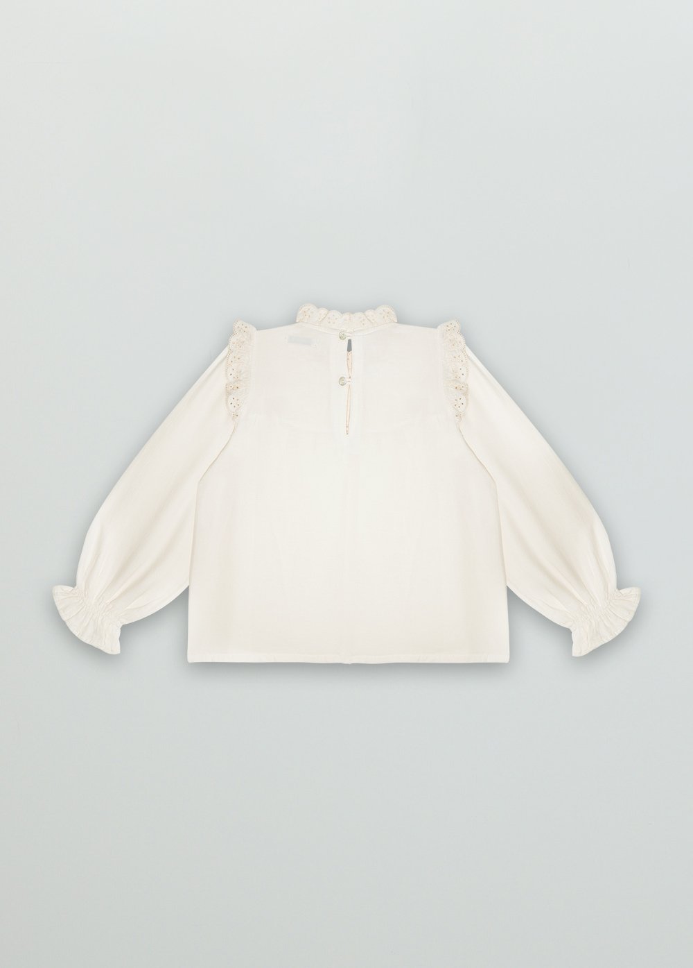 Нарядная блуза цвета экрю с кокеткой в складку, декорированной кружевной оборкой и эластичным рукавами, также декорированными шитьем.Производство: ПОРТУГАЛИЯ