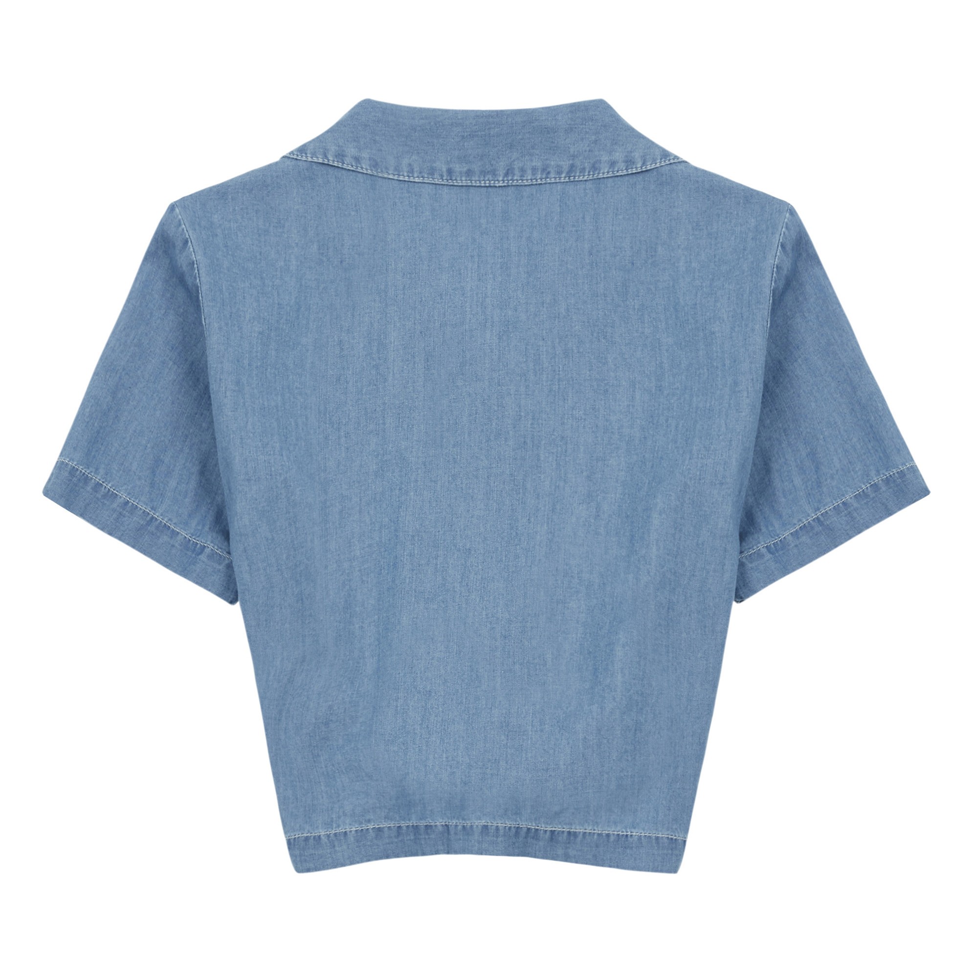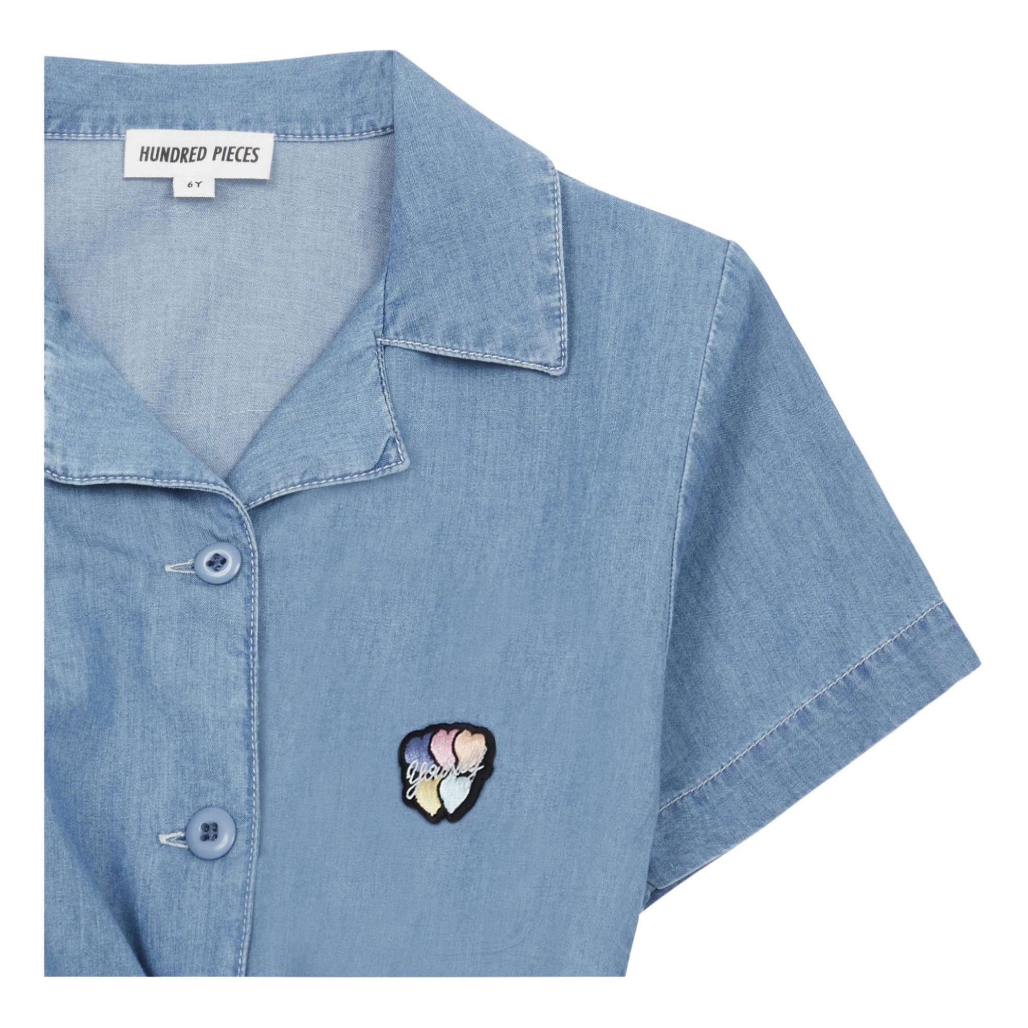 Стильная рубашка из легкого денима. Спереди застегивается на пуговицы и завязывается на узел.На груди аппликация в виде милых разноцветных сердечек, Будет хороша с различными вариантами цветовых решений.