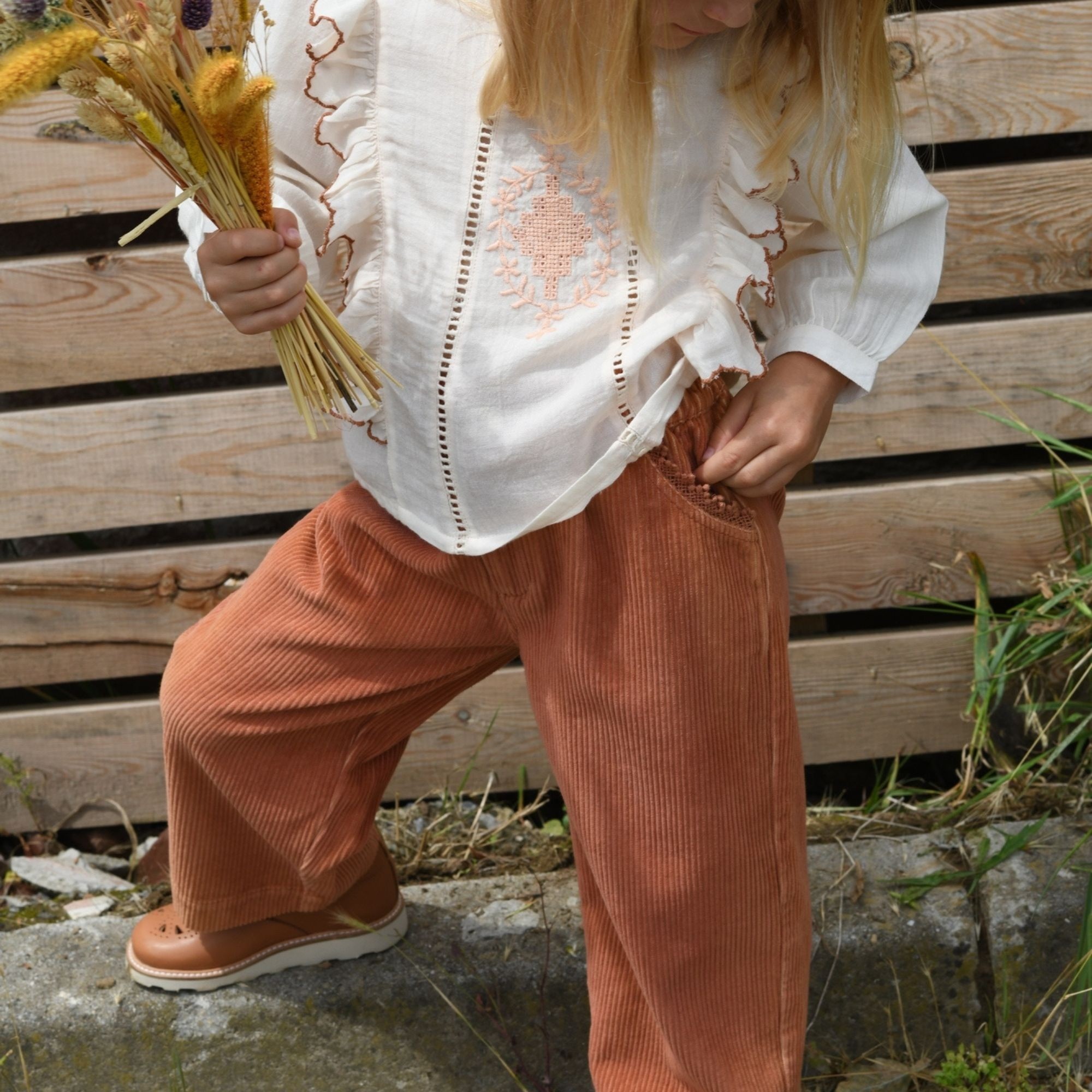 Мягкие вельветовые брюки свободного кроя, талия на резинке, два боковых кармана изящно декорированы ажурной тесьмой.Производство: ФРАНЦИЯ