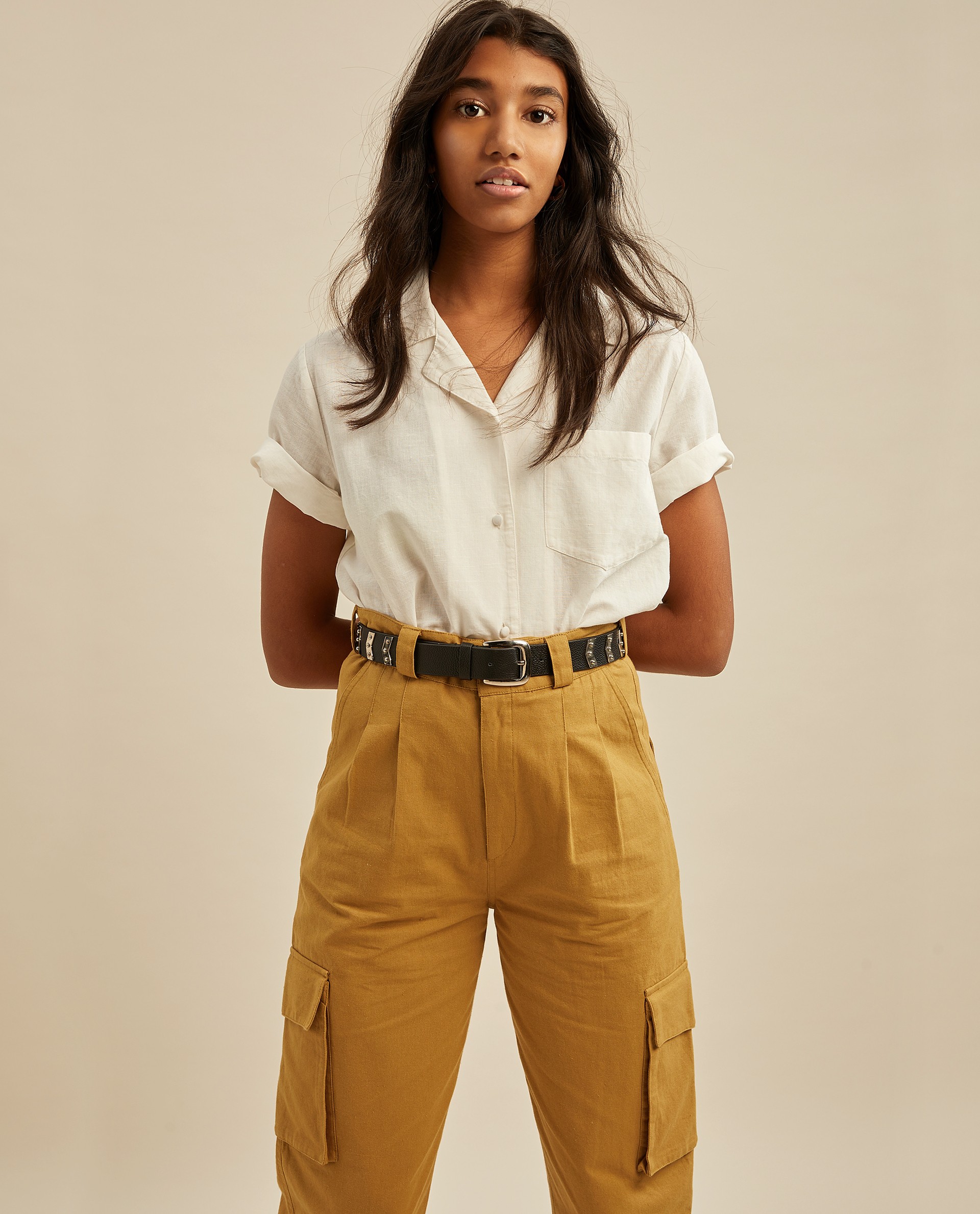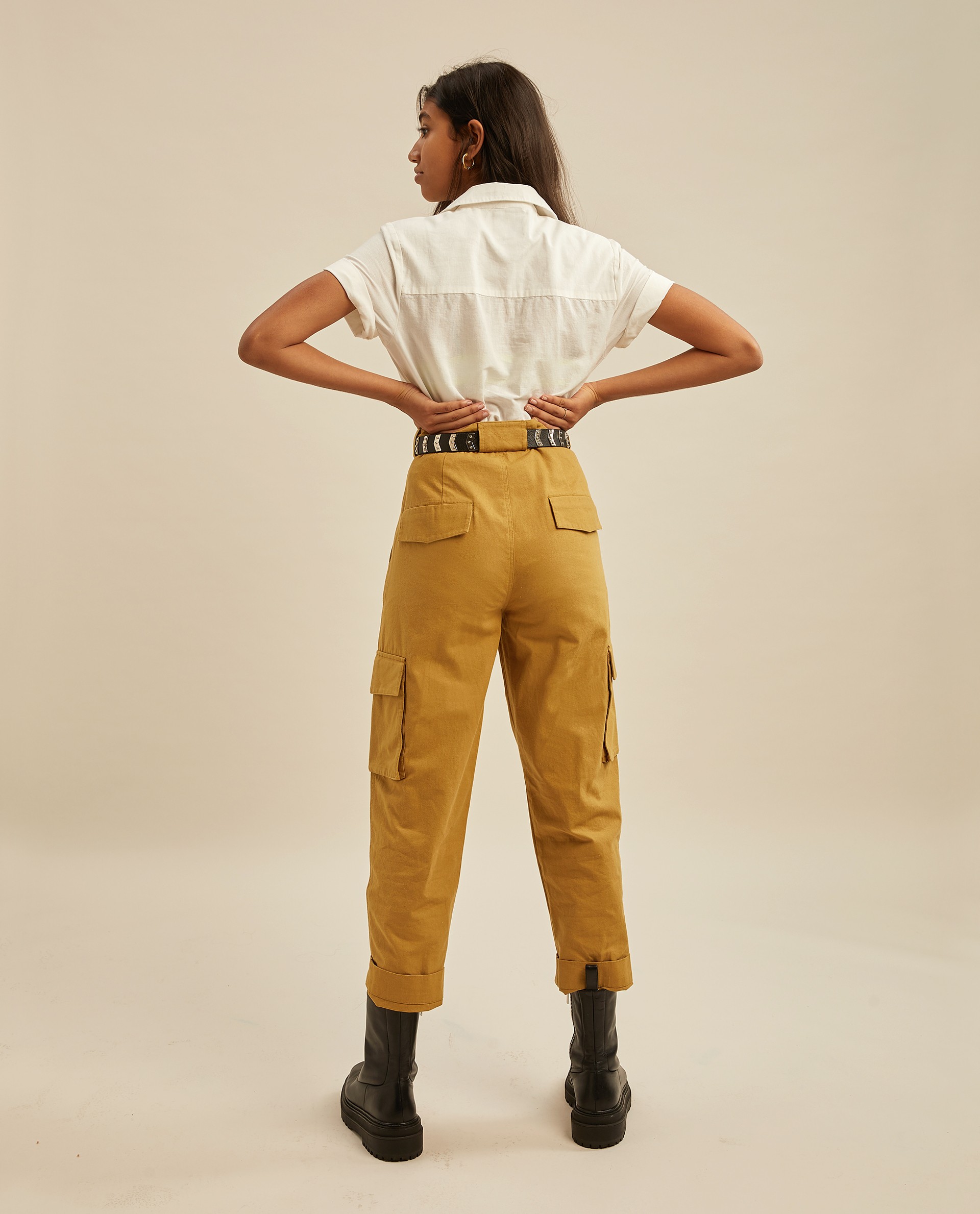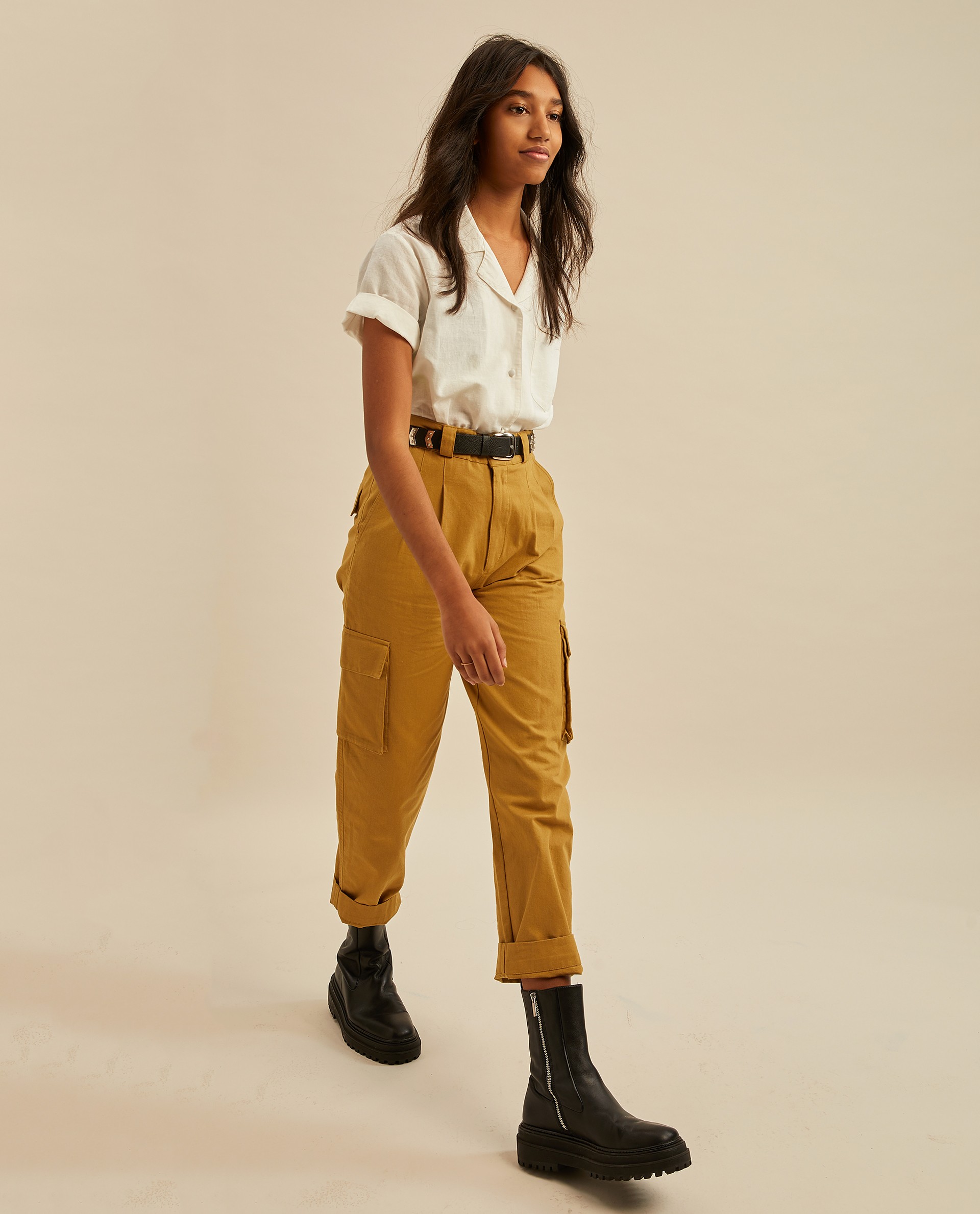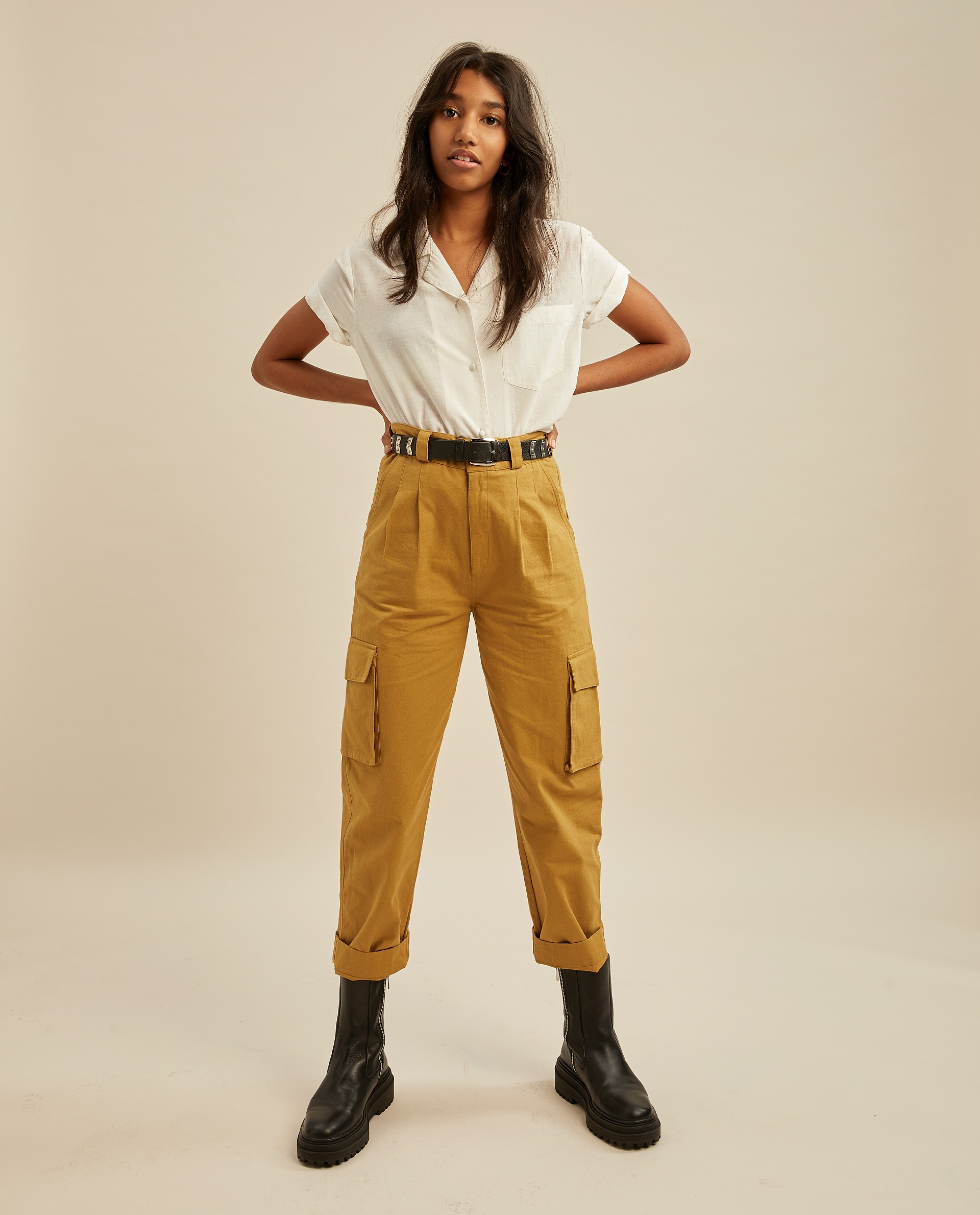 Ультрамодные брюки цвета хаки. Мягкие защипы на талии и шлевки для ремня на поясе.Врезные карманы по бокам и два накладных кармана внизу брюк.Производство: ИНДИЯ