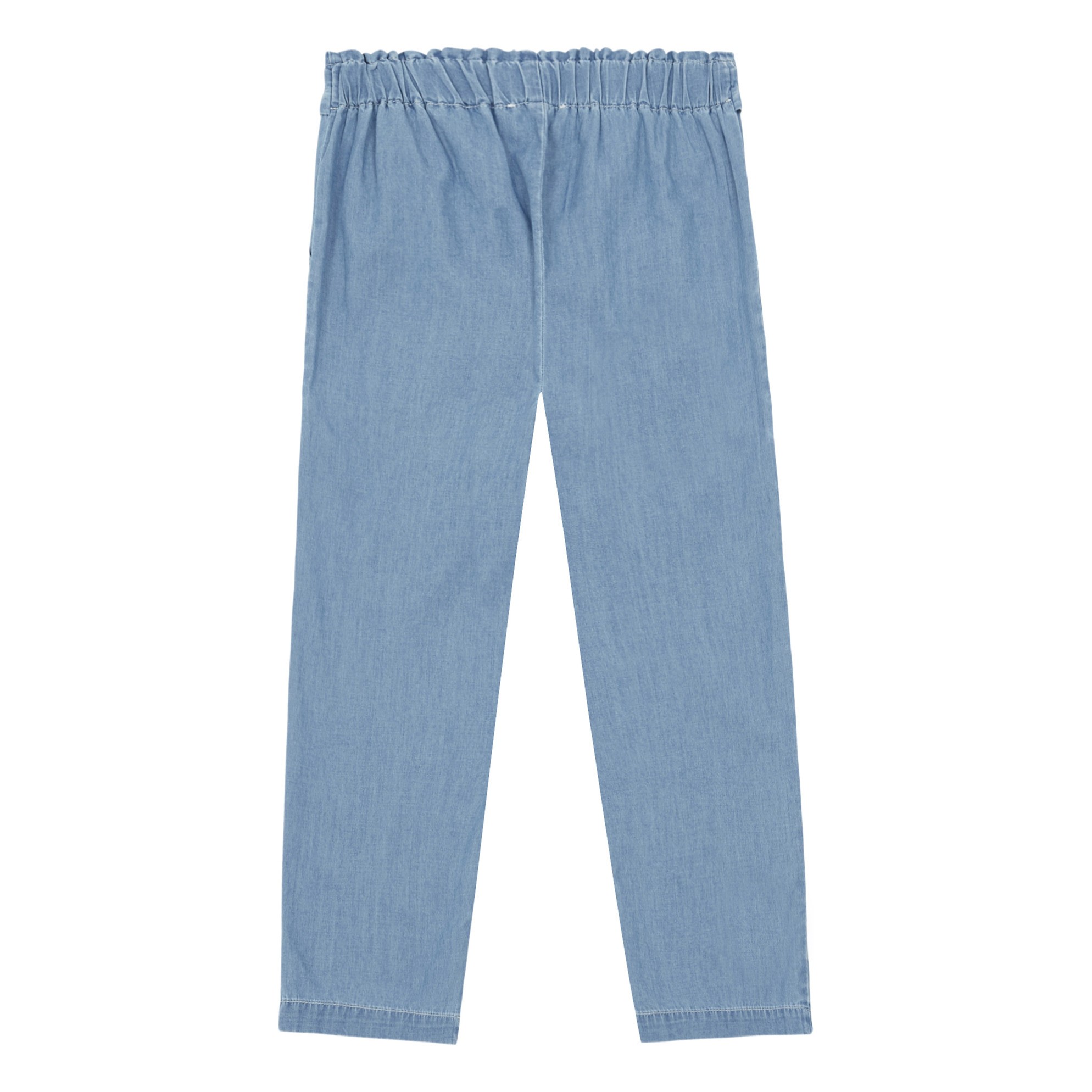 Легкие и мягкие брюки из голубого денима. Удобная резинка внутри пояса, застежка на кнопочку.Большие накладные карманы и декоративный бантик. Что еще нужно чтобы прогулка стала приятной и комфортнойПроизводство: ПОРТУГАЛИЯ