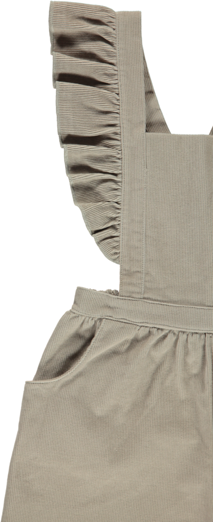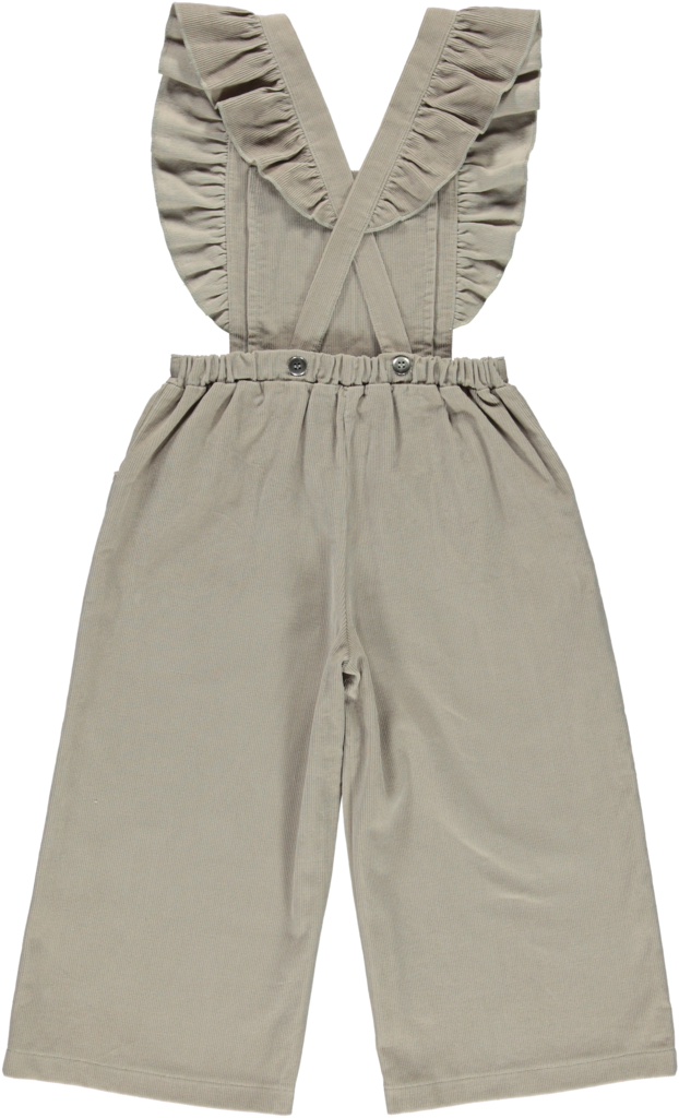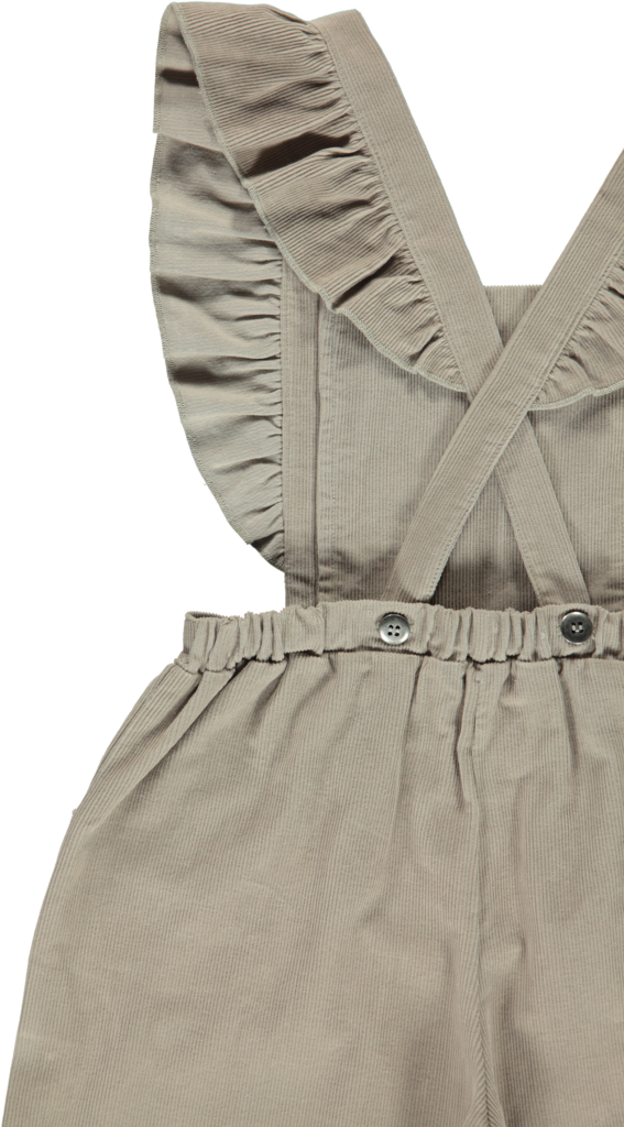 Удобный комбинезон бежевого цвета  из органического хлопка. Романтичная рюш на бретелях, которые регулируются.