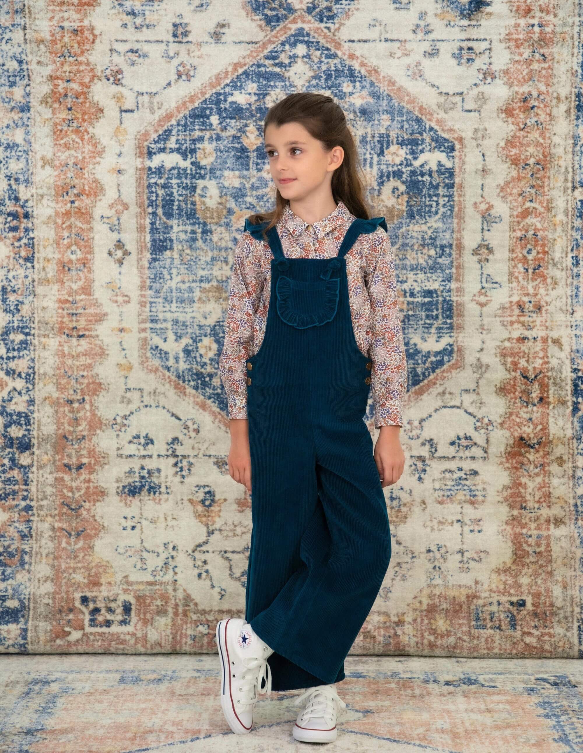 Комбинезон Paula из синего вельвета, выполненный в стиле 70-х, станет модным нарядом этой зимой. Застегивается на золотые пуговицы сбоку, бретельки с оборками регулируются и позволяют подчеркнуть этот ретро-стиль.