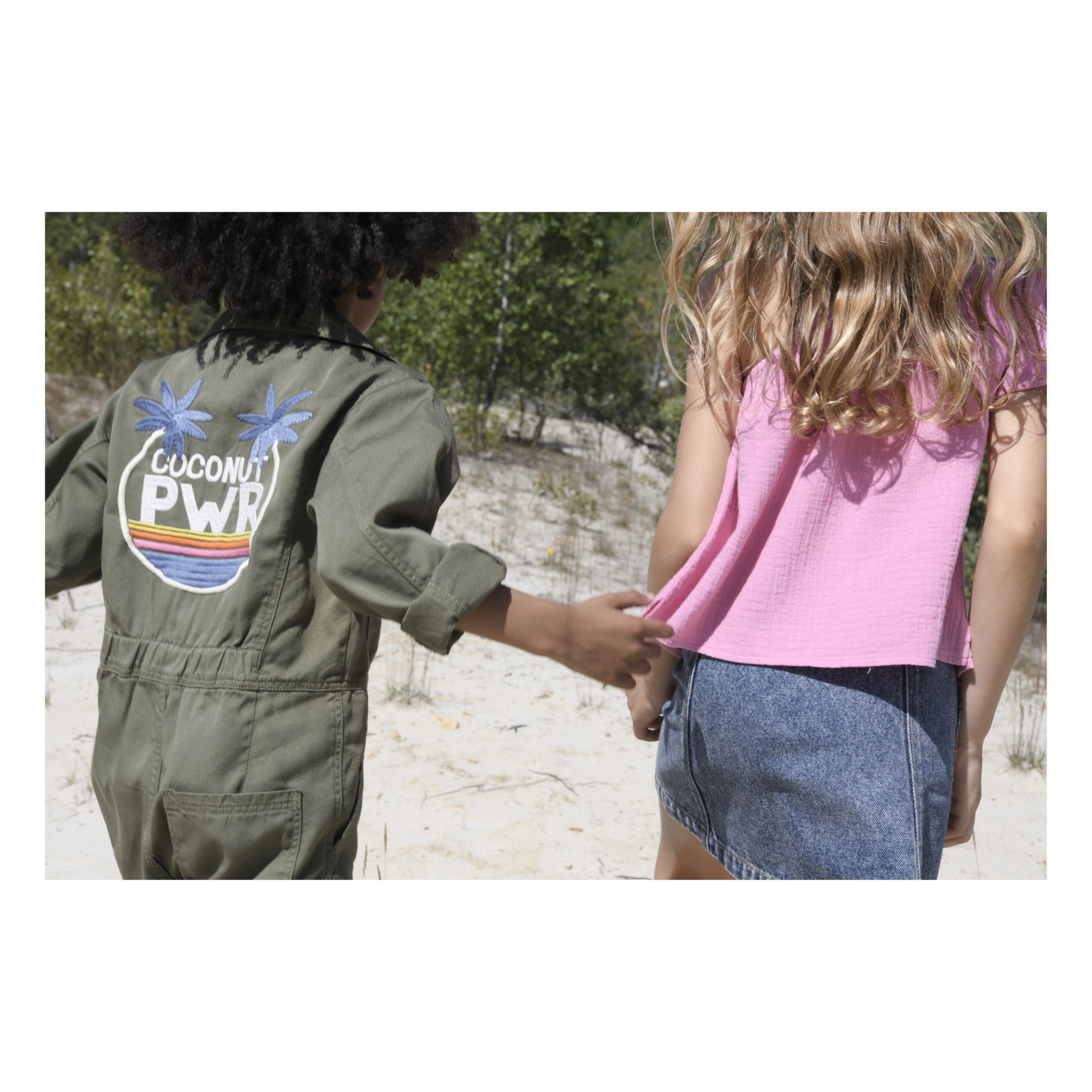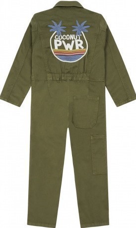 Стильный хлопковый комбинезон красивого темно зеленого цвета. На спинке объемная вышивка "Пальмы", спереди застежка на молнию, большие накладные карманы и на груди кармашки на молниях. Модно, удобно, комфортно.