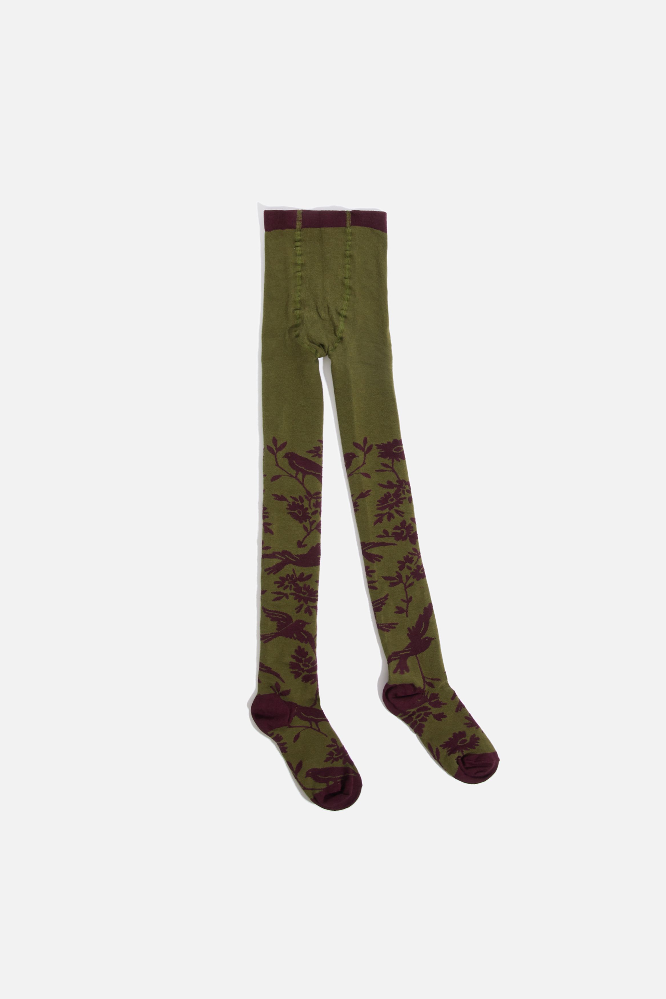 Колготки из смесового хлопка зеленого цвета. Узор из птиц среди бордовой листвы. Оригинальный и стильный аксессуар, который дополнит любой, даже самый смелый образ.Производство: ПОРТУГАЛИЯ