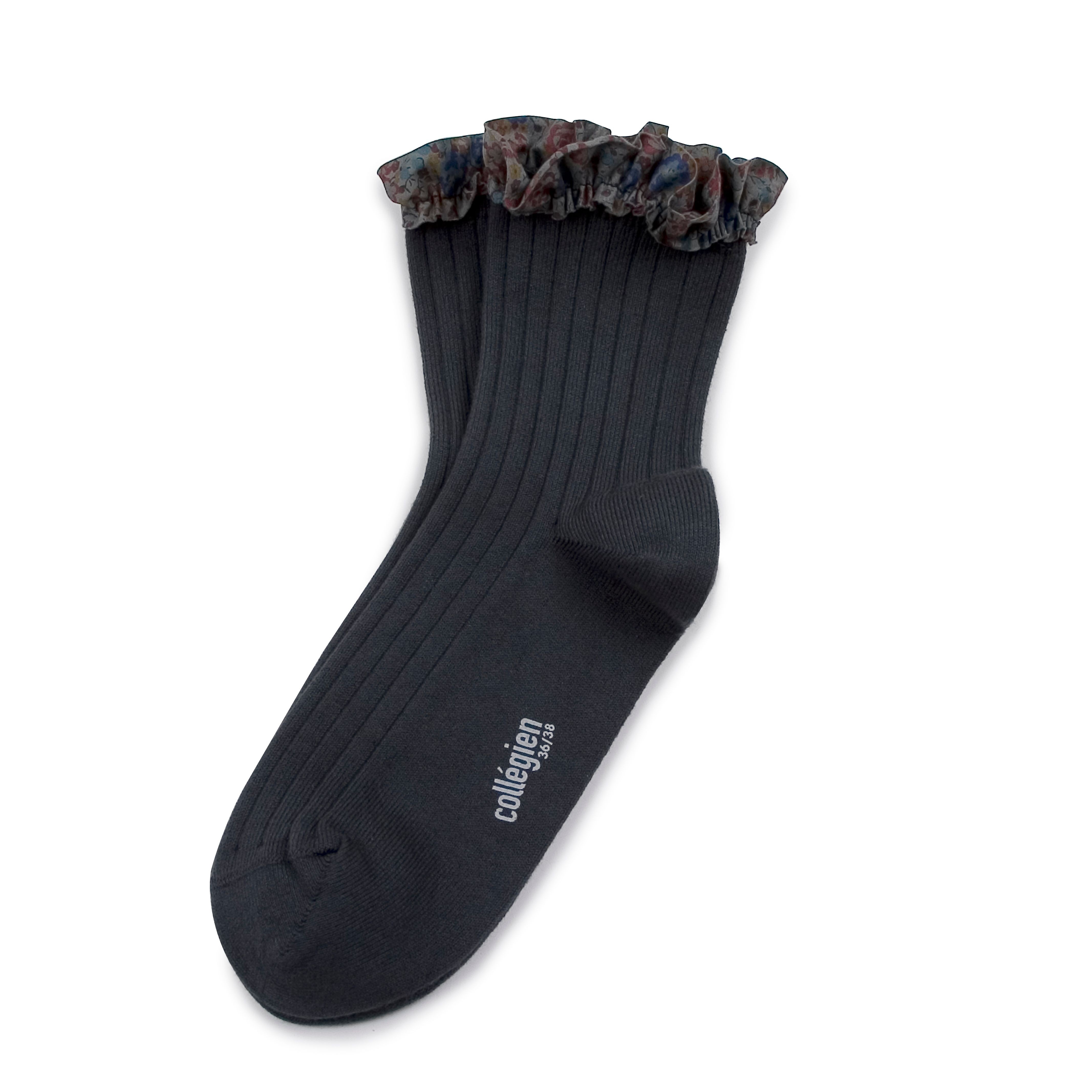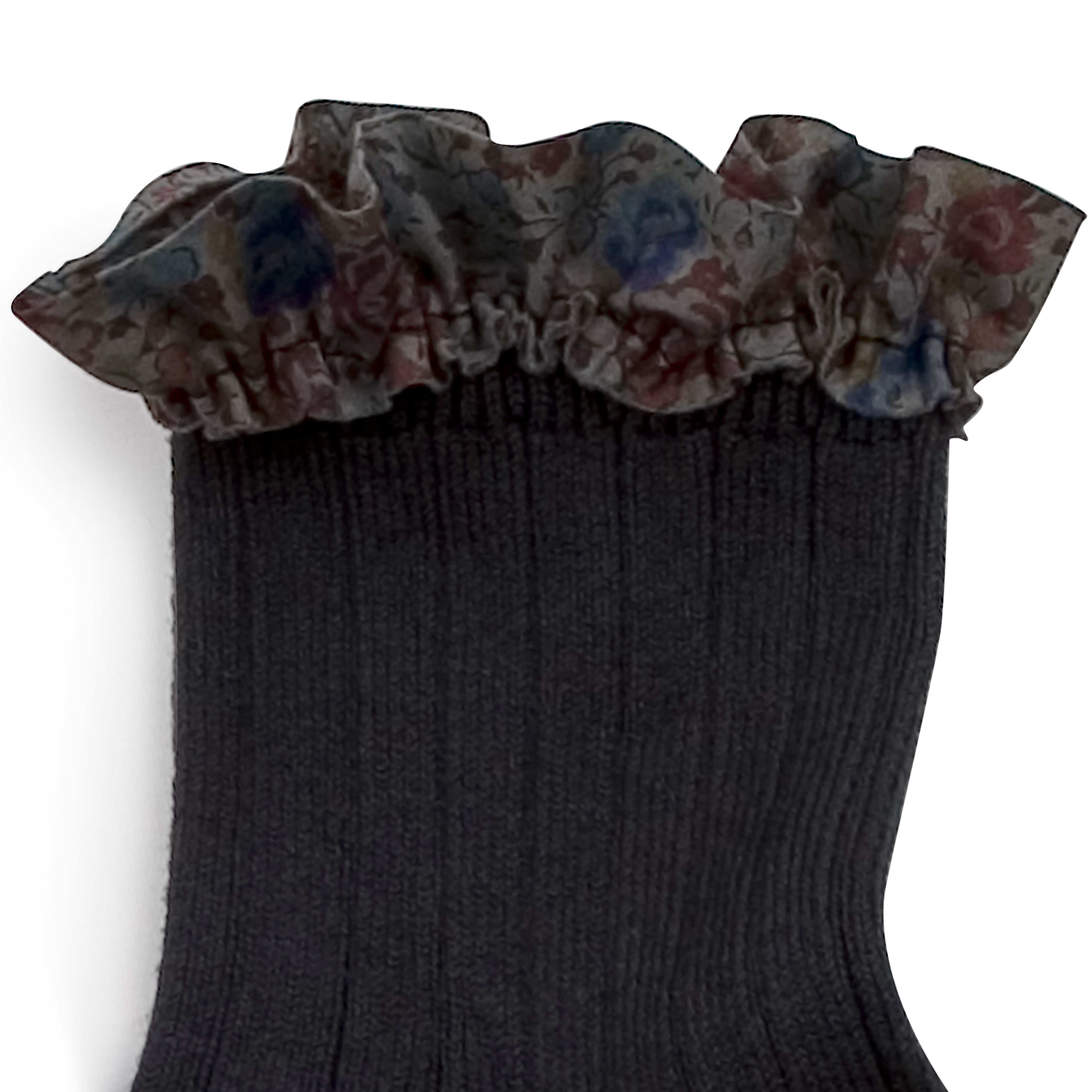 Очень мягкие носки c оборкой из ткани либерти красивого темно-серого цвета, понравятся самым требовательным покупателям. Сидят идеально и свободно, благодаря эластичной резинке. Пятка усилена, а шов в верхней части стопы для максимального комфорта.Производство: КИТАЙ