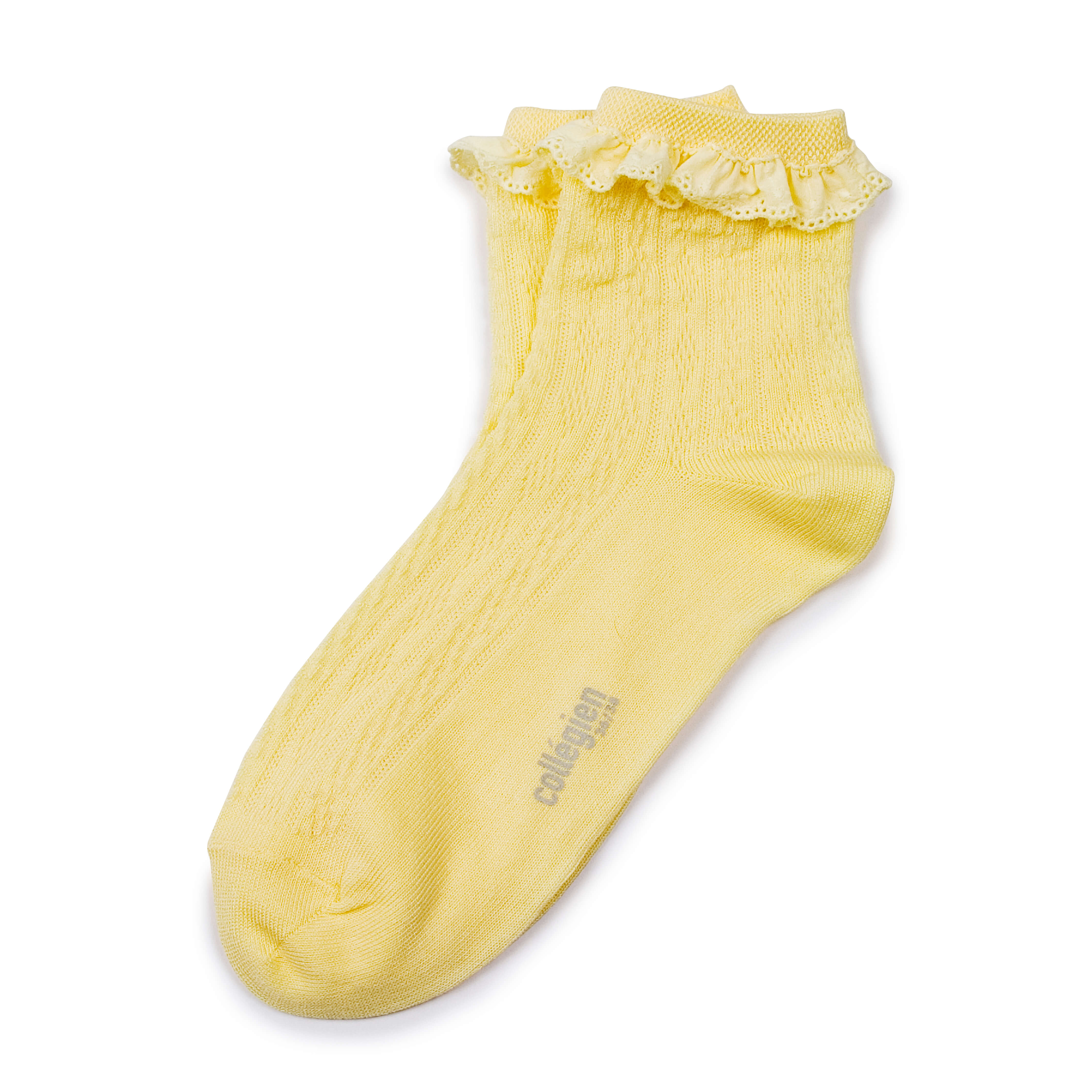 Очень мягкие ажурные носки c оборкой из хлопка (шитье) ярко-желтого цвета понравятся самым требовательным покупателям. Сидят идеально и свободно, благодаря эластичной резинке. Пятка усилена, а шов в верхней части стопы для максимального комфорта.