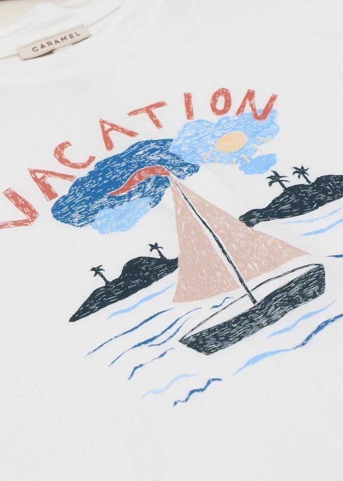 Вдохновленная летними каникулами под парусом, наша белоснежная футболка с морскими рисунками изготовлена из дышащей смеси органического хлопка.
