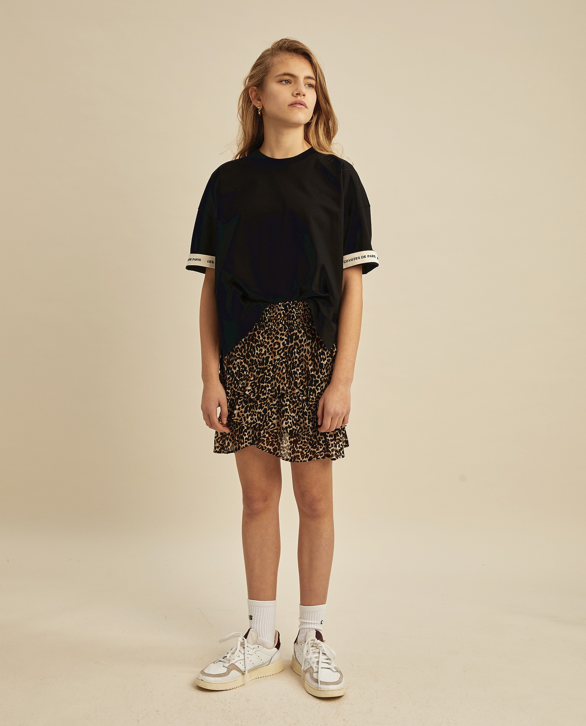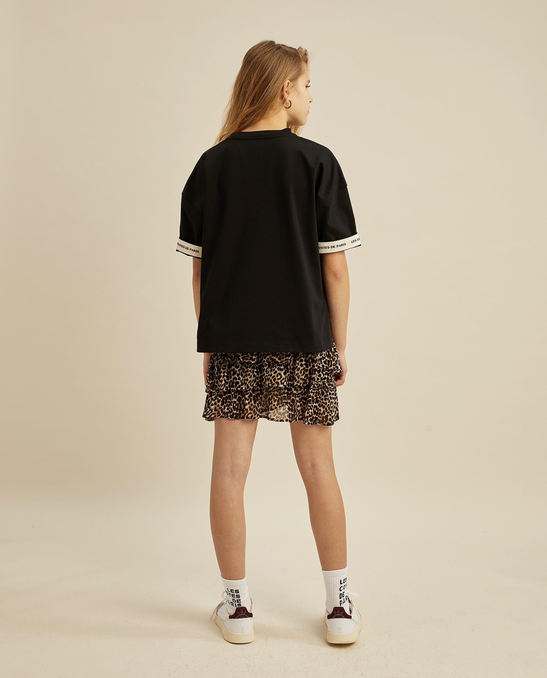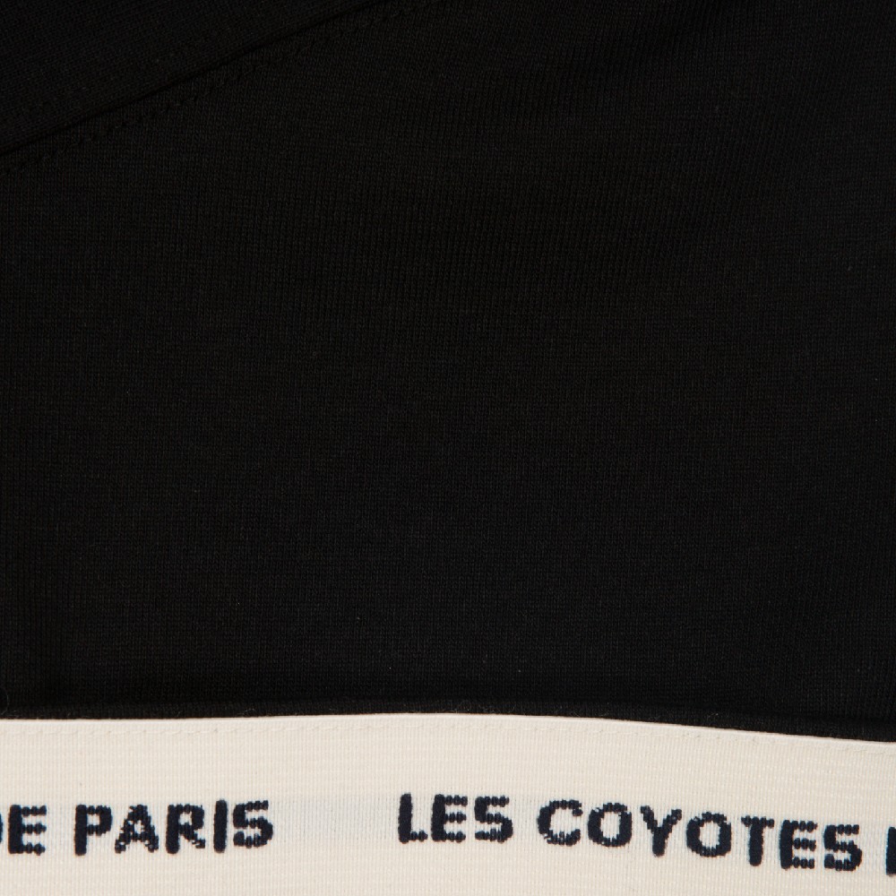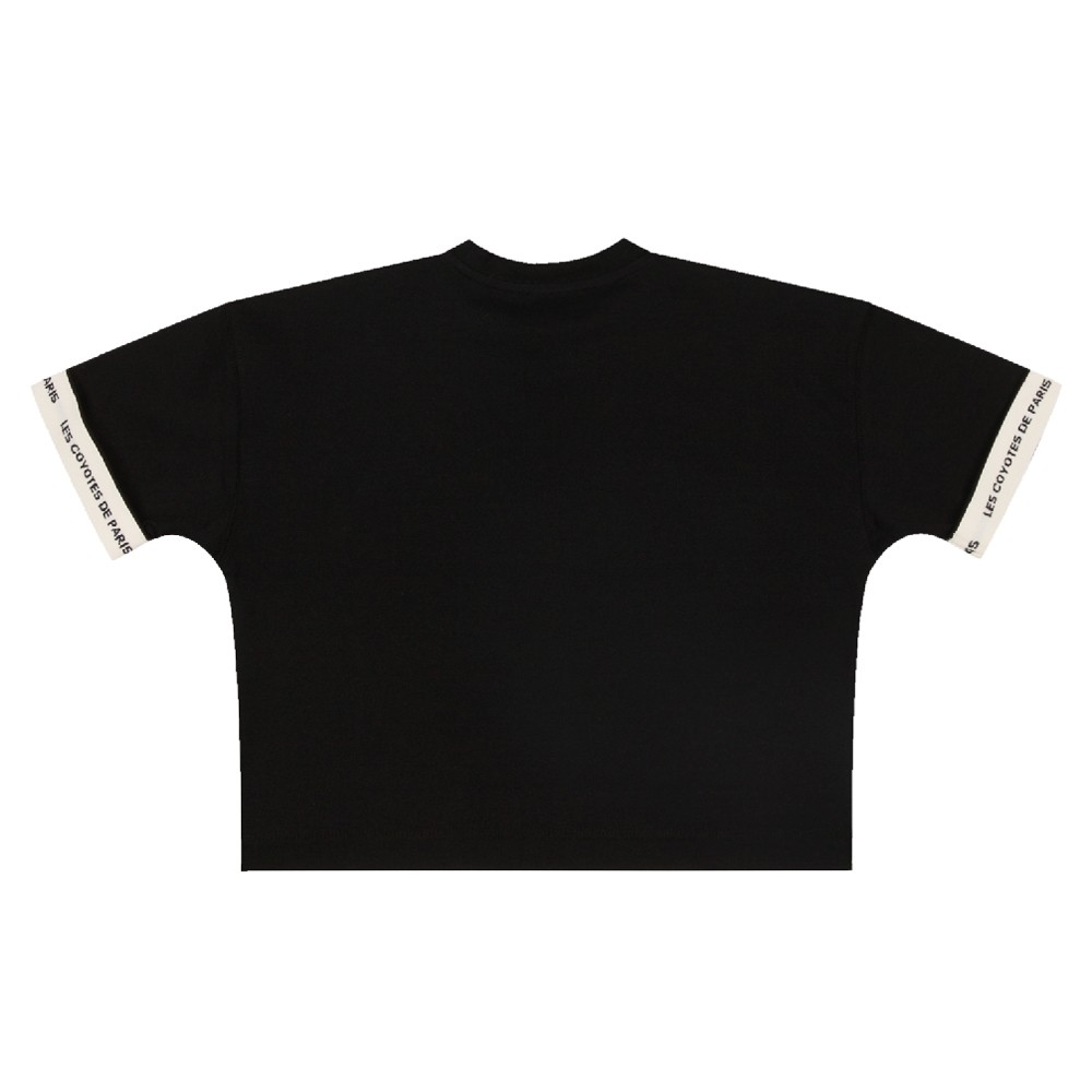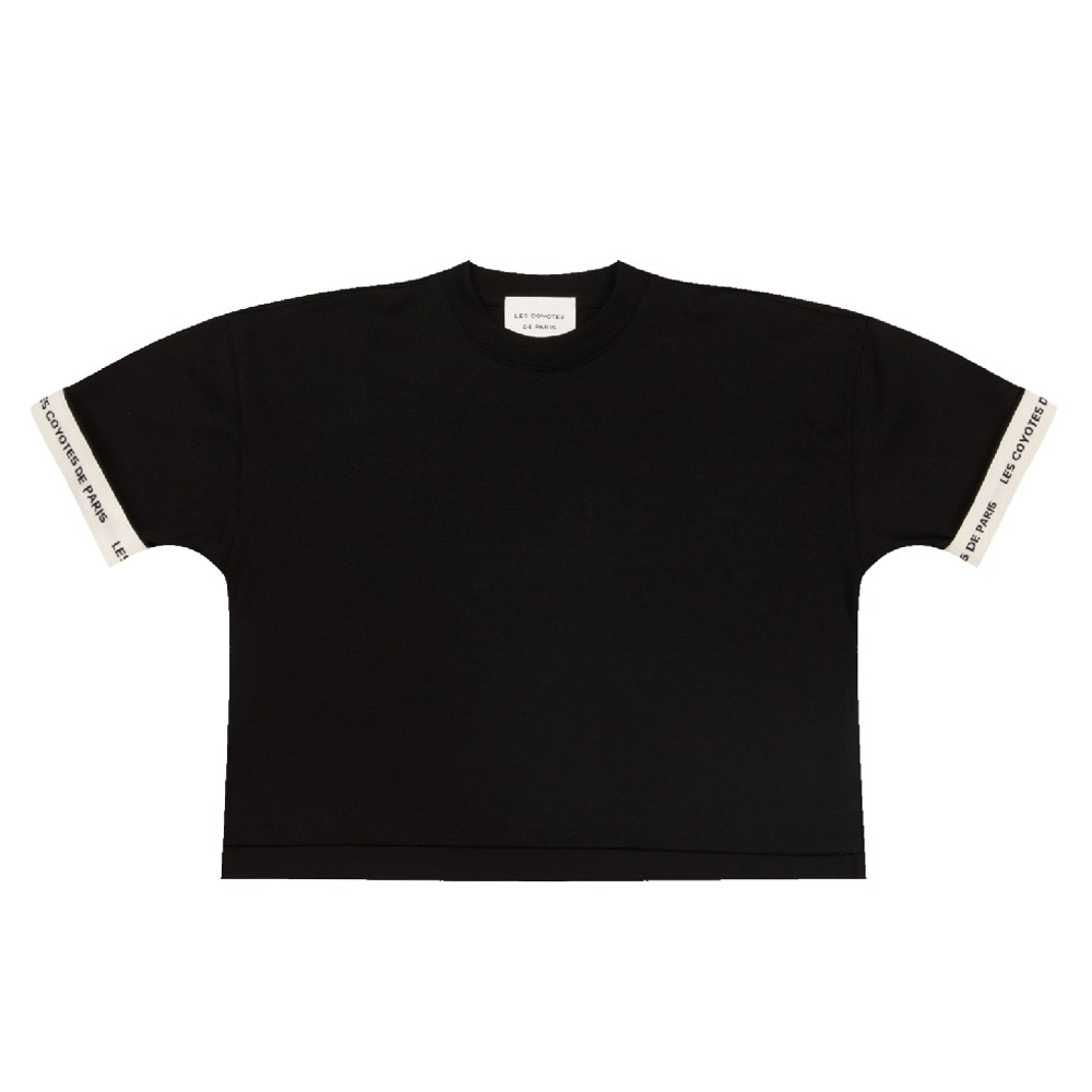 Укороченная футболка черного цвета со спущенным рукавом и боковыми разрезами. Отделка по рукаву декоративной резинкой с надписью бренда.Стильно и удобно.