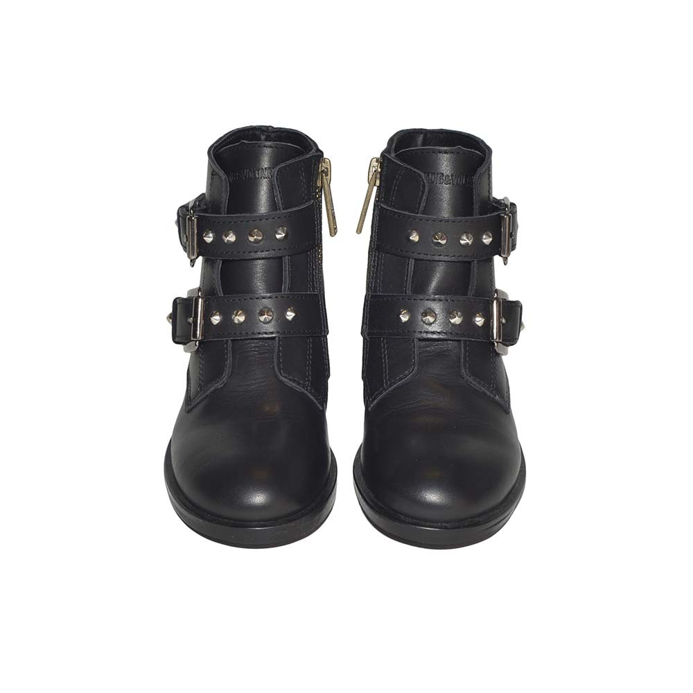 Черные кожаные стильные ботинки от модного бренда. Две декоративные пряжки "усыпаны" металлическими элементами, небольшой каблучок.Застежка сбоку на молнию делает модель очень удобной.Производство: ПОРТУГАЛИЯ