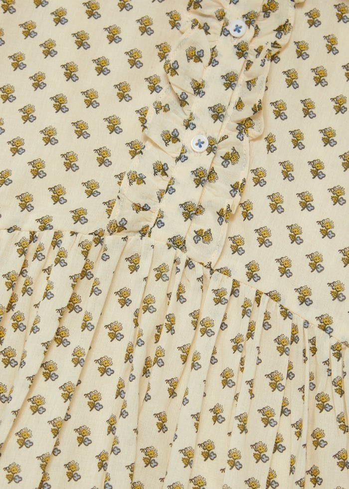 Платье из хлопка с большим воротником Питер Пэн, подчеркнутым оборкой по краю, которая продолжается до планки с пуговицами спереди. Рукава элегантные, с тонкими манжетами, а юбка платья затянута на талии, что придает струящийся силуэт.Производство: ИНДИЯ