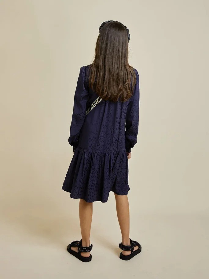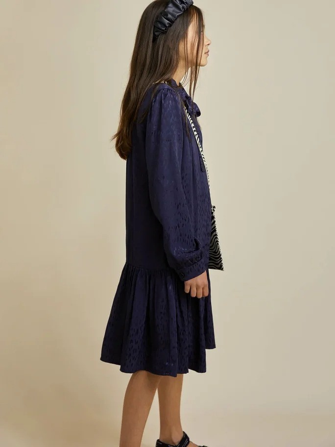 Праздничное платье шикарного темно-синего цвета из района (искусственный шелк) с животным принтом. Воротник плавно переходит в красивый бант, воланы по низу платья, легкое и струящееся.Производство: ТУРЦИЯ