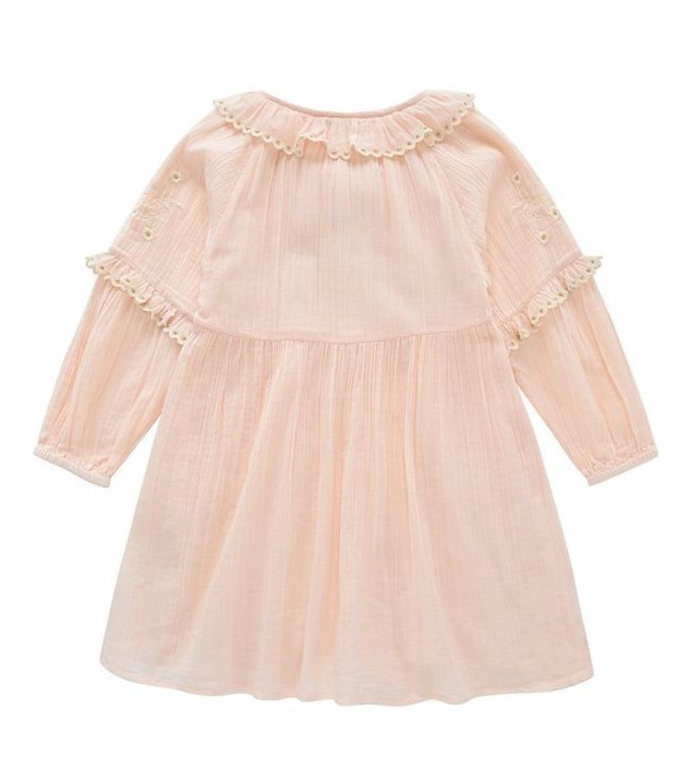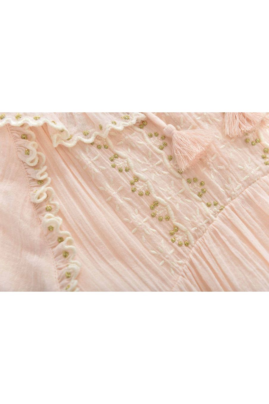 Это нежное платье для утонченных особ, тщательно проработанные детали дизайна придают ему уникальность: воротник с оборками и вышивкой в горошек в тон, отделка зубчатым люрексом, шнуры с отделкой из помпонов ручной работы, пластрон декорирован цветочной вышивкой и люрексом, рукава реглан с зубчатыми оборками и люрексом, французская вышивка в тон на рукавах, сборки на талии для создания красивого объема, два боковых кармана с вышивкой, на подкладке.Производство: ИНДИЯ