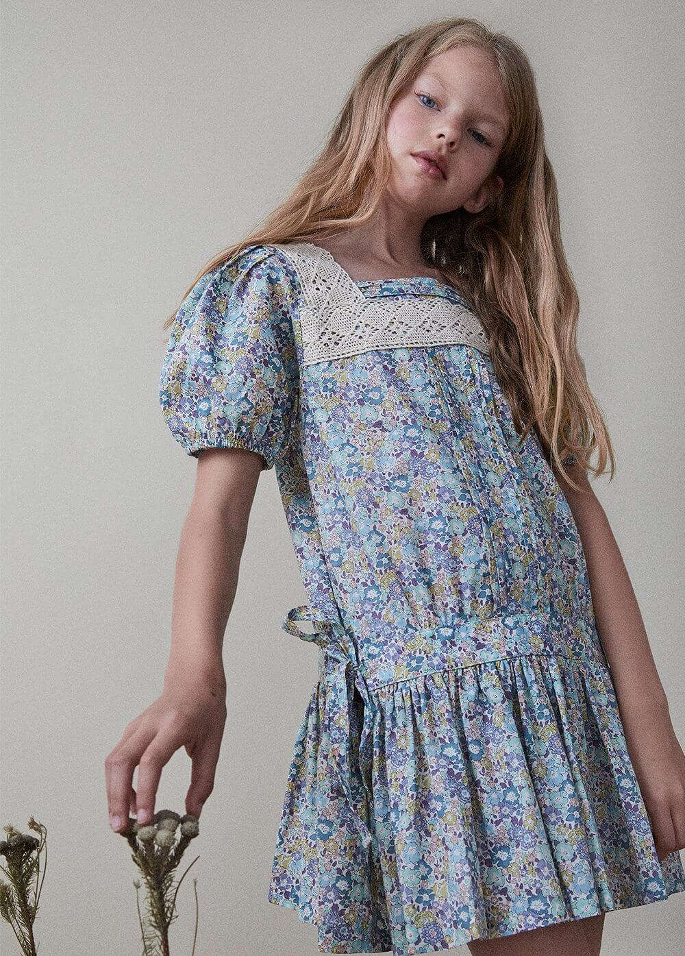 Платье очень хорошо смотрится за счет продуманных деталей декора. Это и расцветка либерти, и квадратный вырез, отделанный шитьем цвета экрю и рукава-воланы, которые так нравятся юным модницам, и даже завязки в виде бантов внизу платья. Все эти элементы делают модель неповторимой.