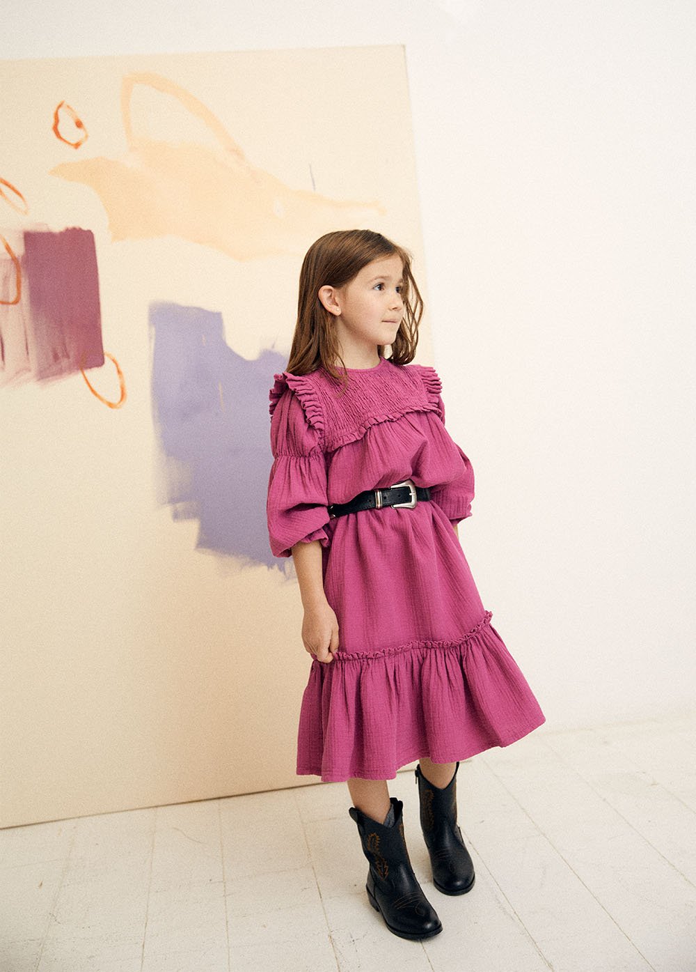 Платье из жатого материала с квадратной кокеткой в складку, длинными рукавами-воланами и рюшами на запястьях. Красивый цвет придает ему праздничный вид. Дополните образ аксессуарами, и Вы будете неотразимы.Производство: ПОРТУГАЛИЯ