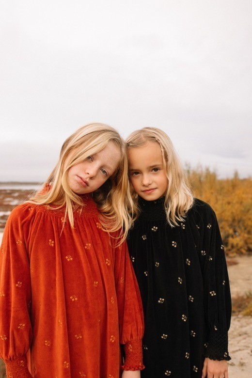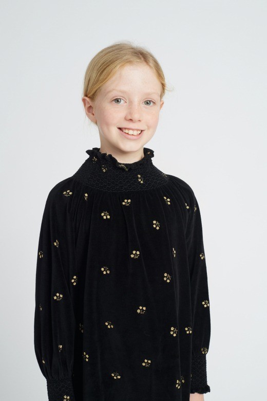 Элегантное платье для особых случаев из велюра из органического хлопка. Воротник и концы рукавов украшены декоративными деталями, платье с фирменной вышивкой с золотистыми цветочными мотивами по всему изделию. Уход: Машинная стирка при температуре 30 градусов, сушка в стиральной машине при низкой температуре (до 110 градусов), гладить во влажном виде, не отбеливать и не использовать окислители.Производство: ПОРТУГАЛИЯ