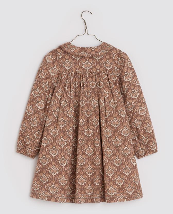 Нежное и уютное платье для повседневной носки, может надеваться для особых случаев. Цветочный принт и благородный цвет кофе с молоком в паре создают образ утонченной леди. Круглая кокетка, декоративная строчка с рисунком на воротнике и подоле, эластичные манжеты, небольшие карманы, застегивается на пуговицы спереди по все длине. Идеально сочетается с объемным трикотажем.Производство: ИНДИЯ