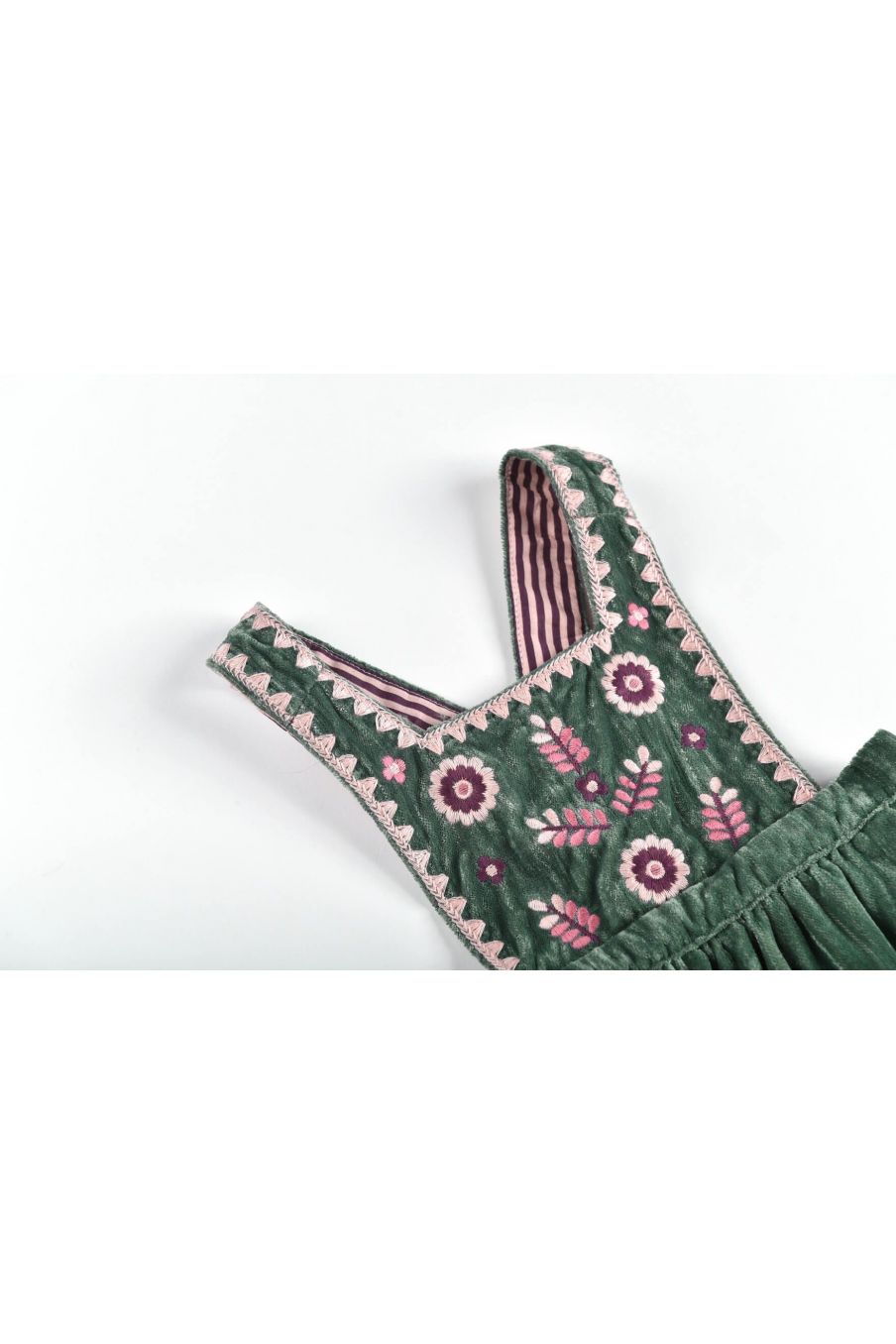 Платье-фартук из бархата займет лидирующее место в Вашем гардеробе. Красочная вышивка на пластроне, геометрическая вышивка фризов на лямках, регулируемые бретельки с пуговицами, слегка присборенная талия, два боковых кармана, полосатая и контрастная подкладка в цвет вышивки.Производство: КИТАЙ