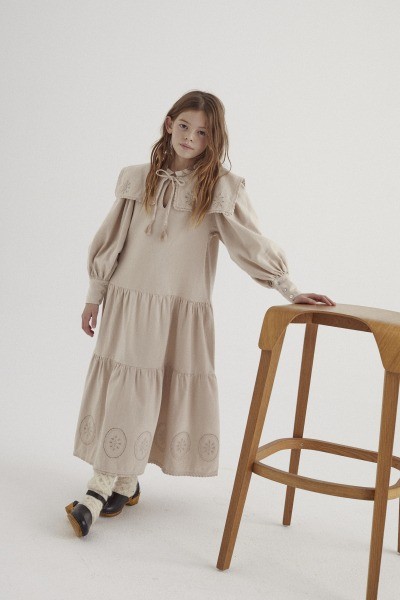 Платье миди с круглым вырезом, застегивающимся спереди на игривый бант с кисточками, большим воротником спереди и сзади с эксклюзивной вышивкой по периметру воротника и по низу изделия. Большой рукав с манжетами на пуговицах-ракушках.Производство: ПОРТУГАЛИЯ