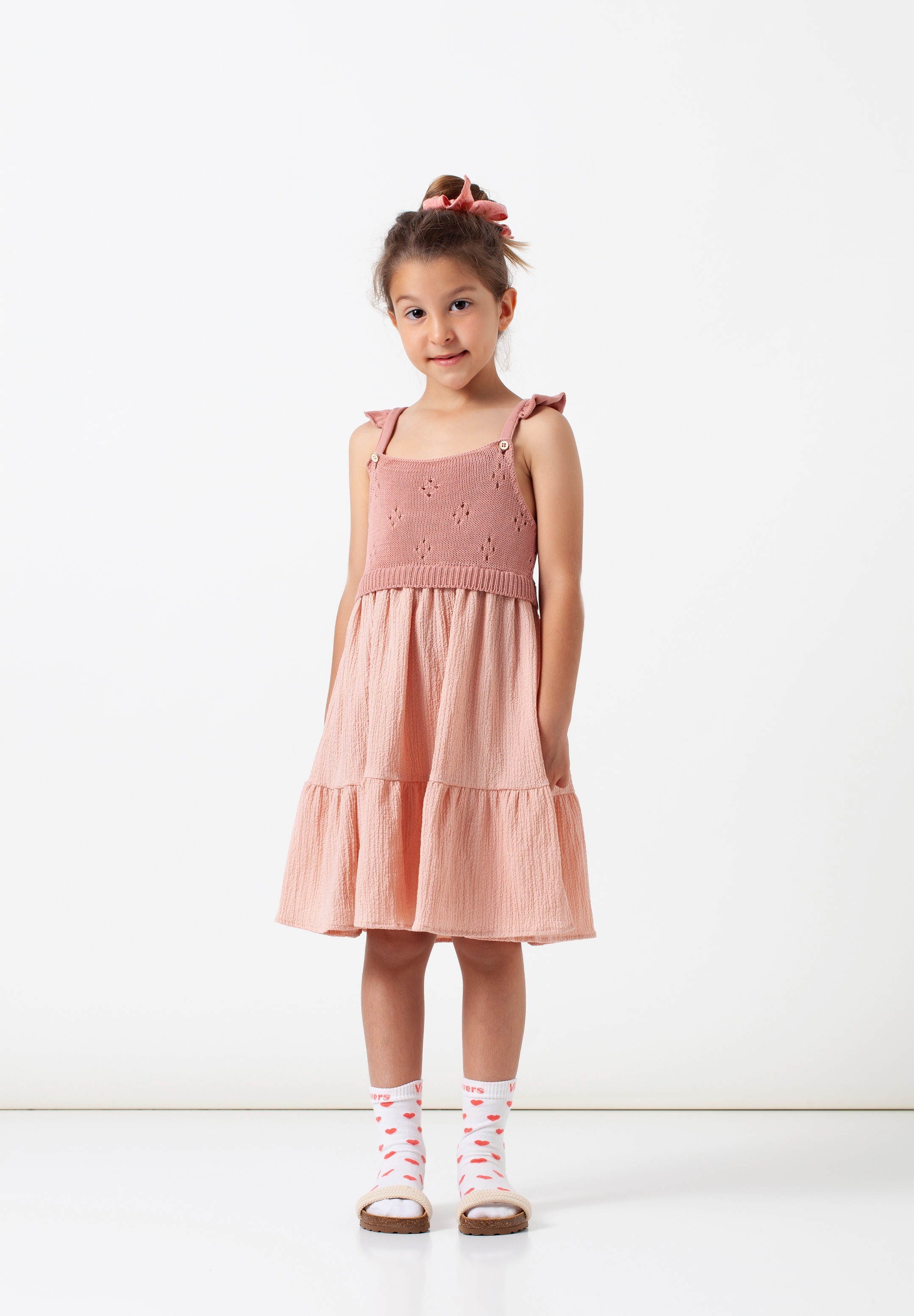 Платье на бретелях с комбинированным плетением. Верх из вискозного трикотажа и юбка из хлопка. Рюши и ажурные детали.Производство: ИСПАНИЯ