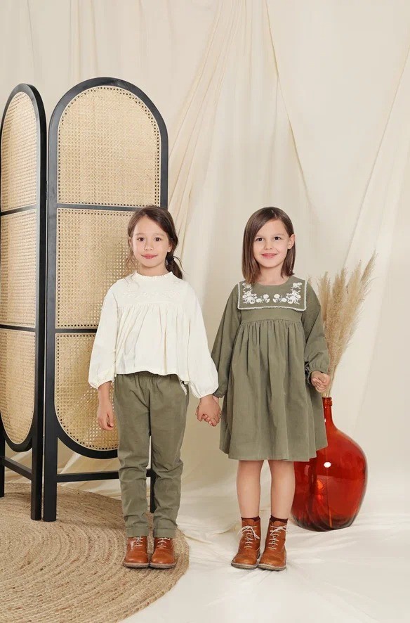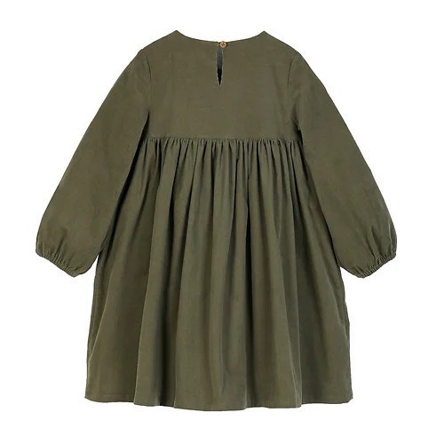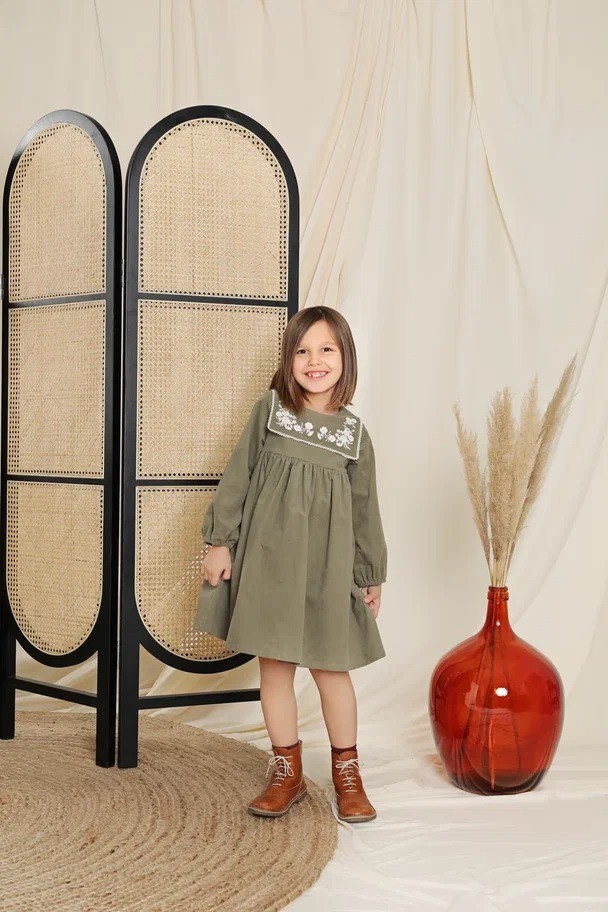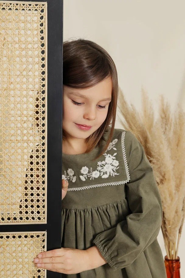 Платье цвета хаки, застегивается на пуговицы сзади. Основным ярким акцентом является контрастная вышивка белого цвета на груди.Производство: КИТАЙ
