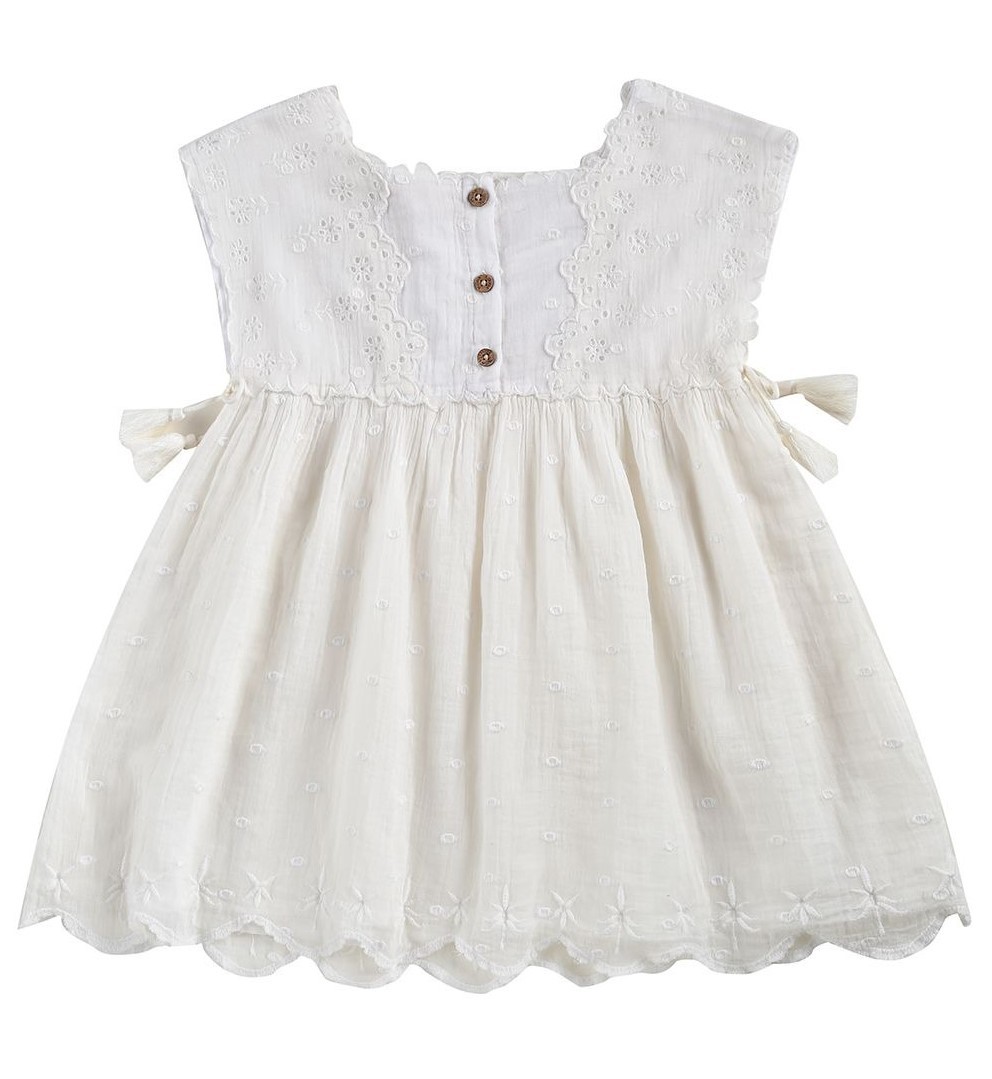 Расклешенное платье без рукавов из хлопковой марлевой ткани, тщательная проработка зубчатой вышивки на вырезе, проймах и по низу платья, вышивка гладью, застежка на пуговицы сзади (пуговицы из кокоса), завязки по бокам, на подкладке. Эта модель отлично подойдет для особых случаев. Рекомендации по уходу: бережная ручная стирка или в стиральной машине в деликатном режиме с использованием мягкого стирального порошка.Производство: ИНДИЯ