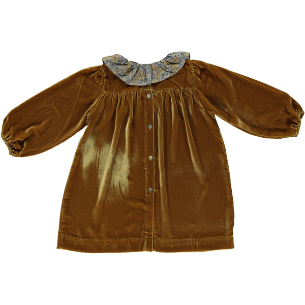 Элегантное платье из тончайшего шелкового велюра шикарного золотого цвета. Воротник с оборками и красивым цветочным принтом LIBERTY. Перламутровые пуговицы сзади.Производство: ПОРТУГАЛИЯ