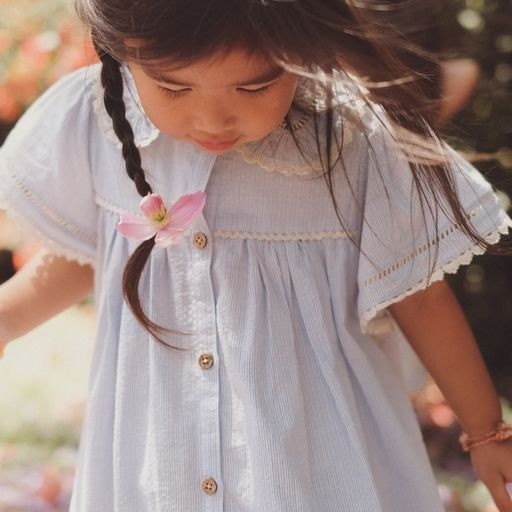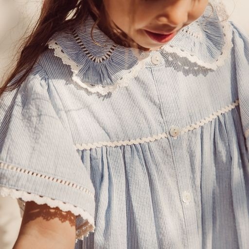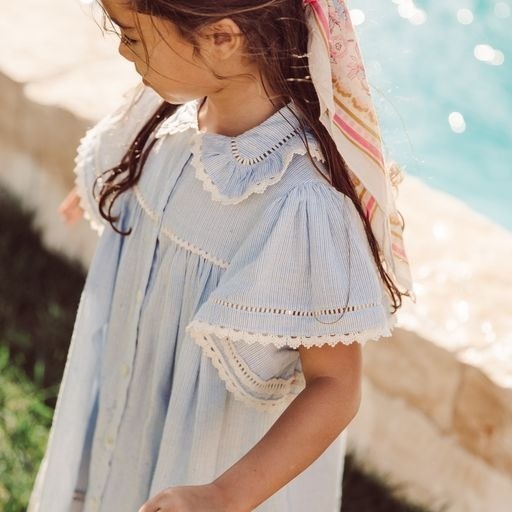 Милое платье из хлопка с воротником с оборками, боковыми карманами. Тонкие бело-голубые полоски идеально подходят для прогулки у моря, рукава-бабочки с кружевной отделкой, лестничная ажурная кружевная бейка по воротнику, рукавам и низу, планка с пуговицами спереди до конца, цветочная вышивка по низу платья.